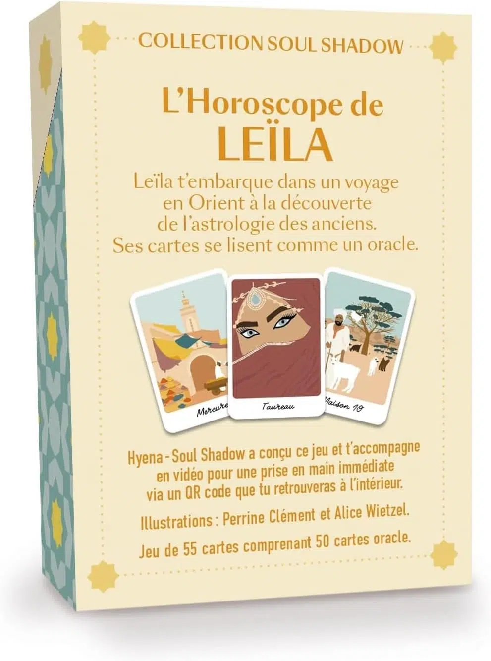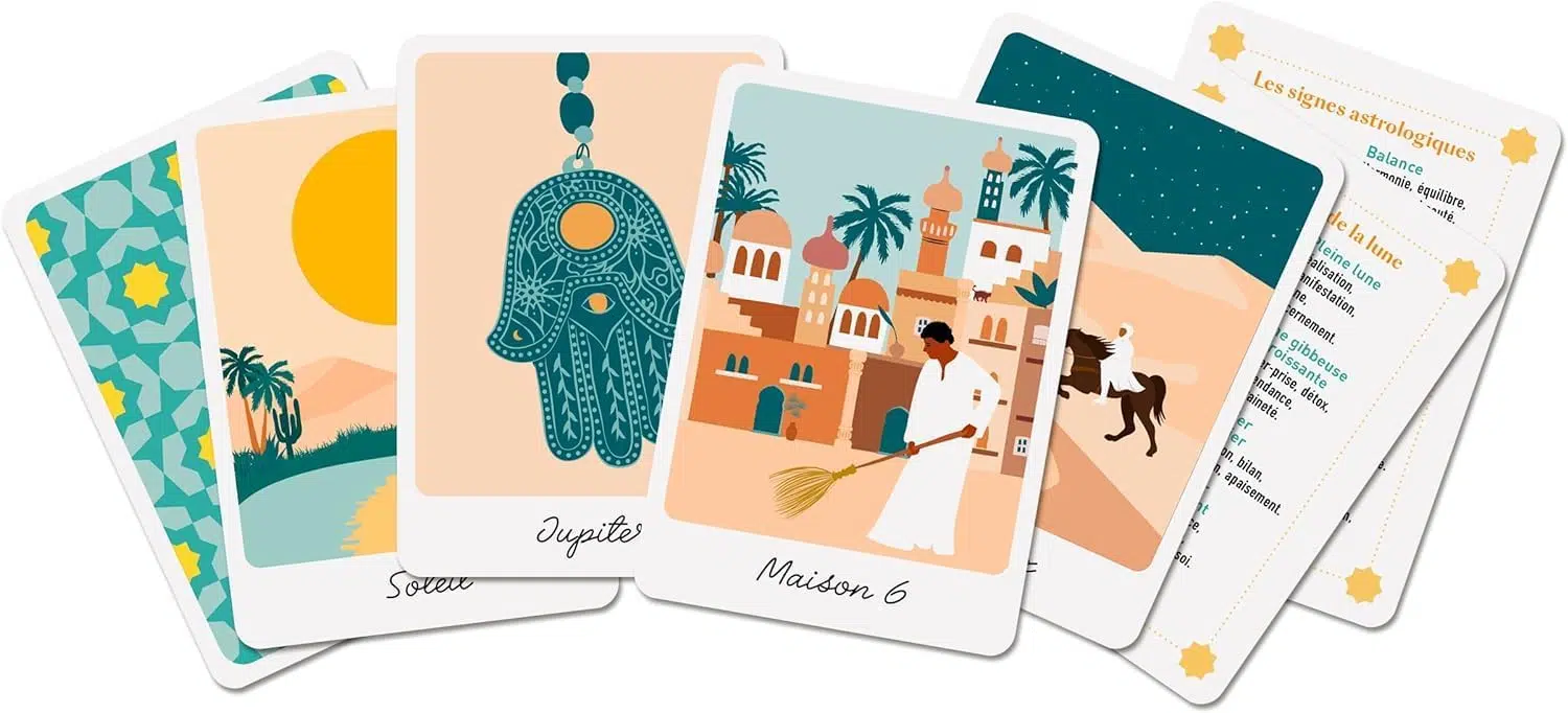 Leïla vous embarque dans un voyage en orient à la découverte de l’astrologie des anciens. Ses 50 cartes se lisent comme un oracle et sa version imagée vous aidera à saisir les premières notions d’astrologie.