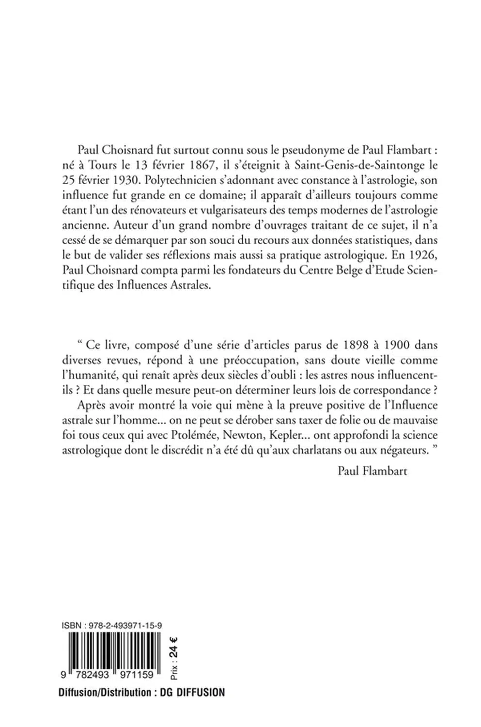 « Ce livre, composé d'une série d'articles parus de 1898 à 1900 dans diverses revues, répond à une préoccupation, sans doute vieille comme l'humanité, qui renaît après deux siècles d'oubli : les astres nous influencent-ils ? Et dans quelle mesure peut-on déterminer leurs lois de correspondance ? Après avoir montré la voie qui mène à la preuve positive de l'Influence astrale sur l'homme... on ne peut se dérober sans taxer de folie ou de mauvaise foi tous ceux qui avec Ptolémée, Newton, Kepler... ont approfondi la science astrologique dont le discrédit n'a été dû qu'aux charlatans ou aux négateurs. »