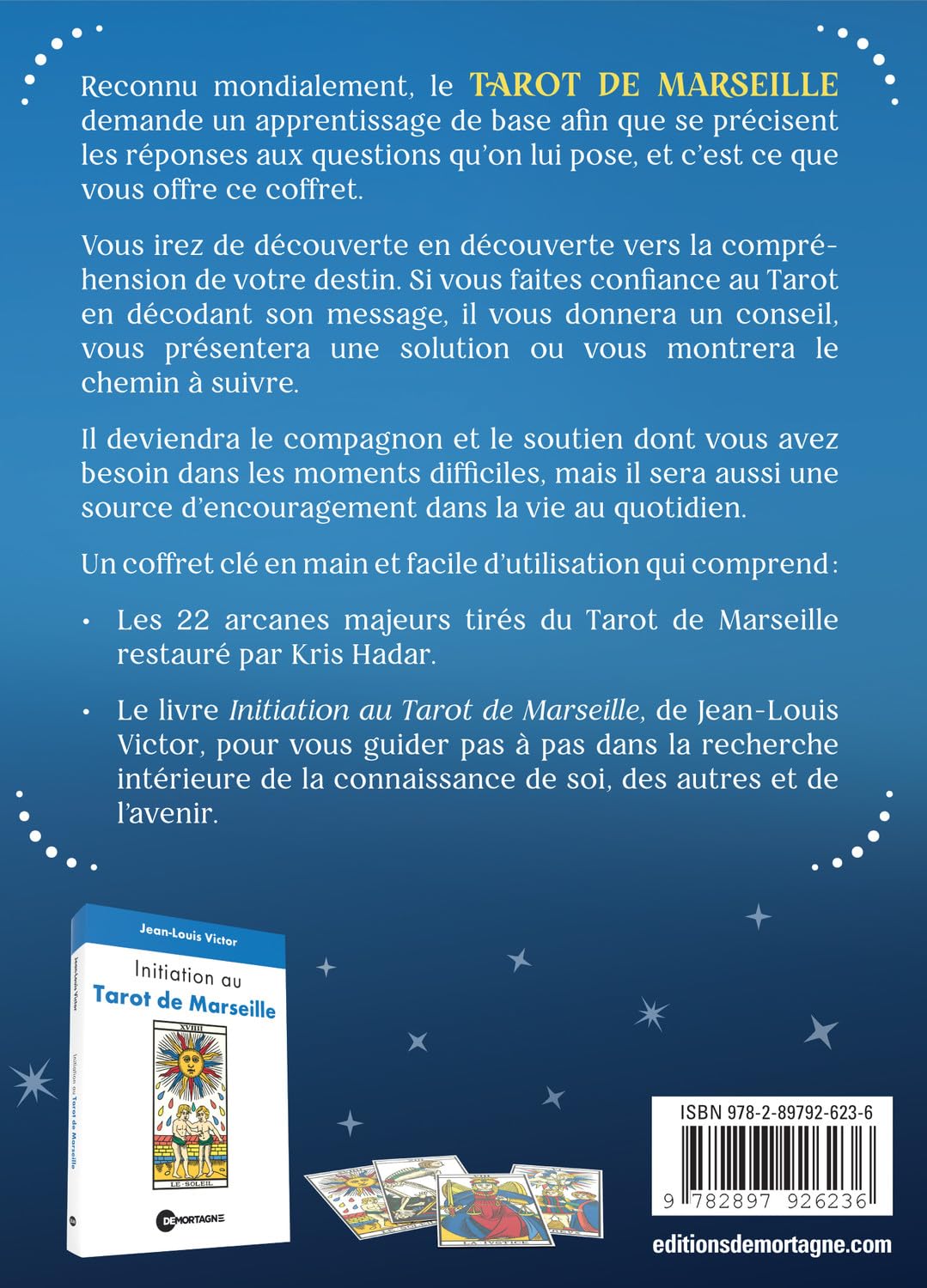 Reconnu mondialement, le Tarot de Marseille demande un apprentissage de base afin que se précisent les réponses aux questions qu’on lui pose, et c’est ce que vous offre ce coffret. Vous irez de découverte en découverte vers la compréhension de votre destin. Si vous faites confiance au Tarot en décodant son message, il vous donnera un conseil, vous présentera une solution ou vous montrera le chemin à suivre. Il deviendra le compagnon et le soutien dont vous avez besoin dans les moments difficiles, mais il sera aussi une source d’encouragement dans la vie au quotidien.