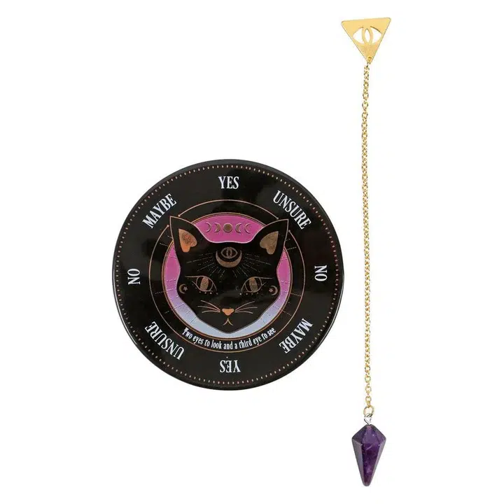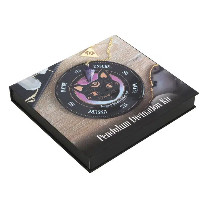 Ce coffret élégant contient un pendule en Améthyste ainsi qu'une plaque de divination en céramique peinte, le tout dans un petit coffret à fermeture magnétique pour le transporter partout avec soi.