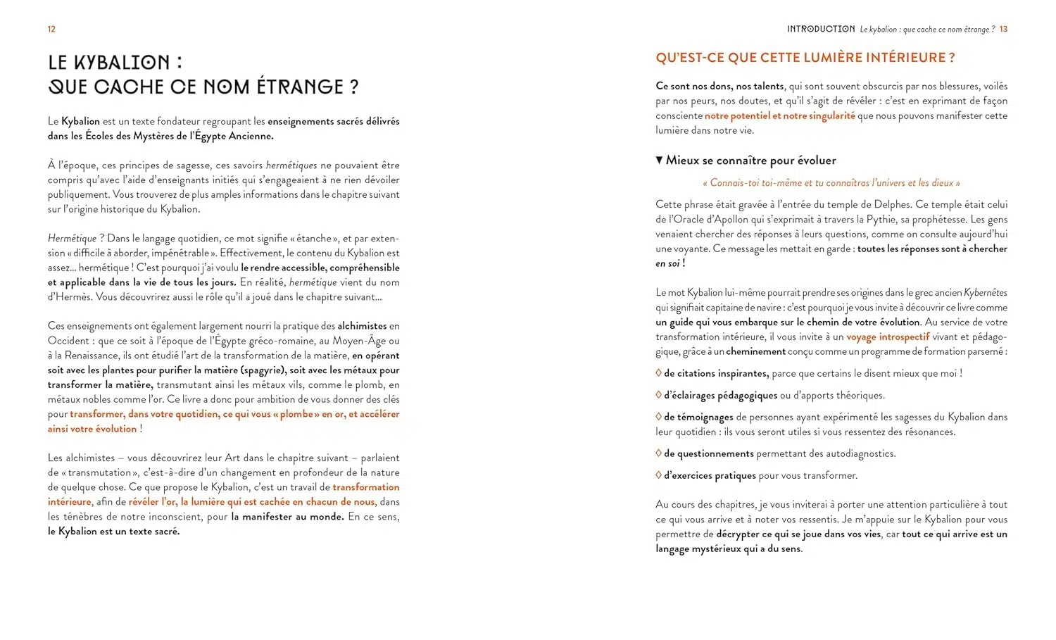Le Kybalion vous invite à révéler la lumière cachée en vous et à la manifester au monde !Le Kybalion, texte fondateur regroupant les enseignements sacrés délivrés dans les Écoles des Mystères de l’Égypte Ancienne, ne pouvait autrefois être compris qu’à l’aide d’enseignants initiés. Ces enseignements étaient souvent considérés comme hermétiques et difficiles à aborder. Ce livre tend donc à les rendre accessibles, compréhensiblesetapplicables danslaviedetouslesjours.Autravers des 7 lois cosmiques, opérez une véritable transformation intérieure pour vivre en harmonie avec vous-même et avec le monde.Ce guide vous invite à un voyage introspectif, grâce à un cheminement ponctué :