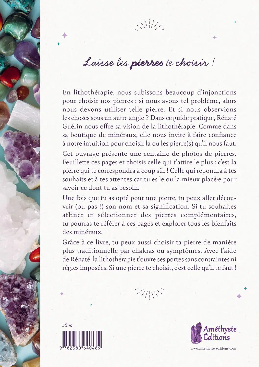 Cet ouvrage présente une centaine de photos de pierres. Feuillette ces pages et choisis celle qui t’attire le plus : c’est la pierre qui te correspondra à coup sûr ! Une fois que tu as opté pour une pierre, tu peux aller découvrir (ou pas !) son nom et sa signification. Si tu souhaites affiner et sélectionner des pierres complémentaires, tu pourras te référer à ces pages et explorer tous les bienfaits des minéraux.