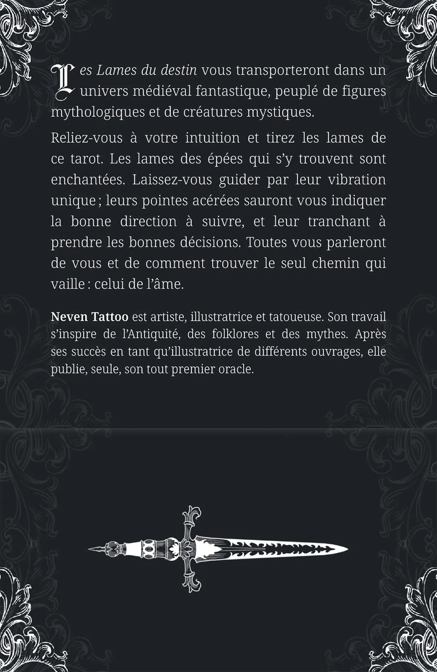 Reliez-vous à votre intuition et tirez les lames de ce "tarot". Les lames des épées qui s’y trouvent sont enchantées. Laissez-vous guider par leur vibration unique ; leurs pointes acérées sauront vous indiquer la bonne direction à suivre, et leur tranchant à prendre les bonnes décisions. Toutes vous parleront de vous et de comment trouver le seul chemin qui vaille : celui de l’âme.