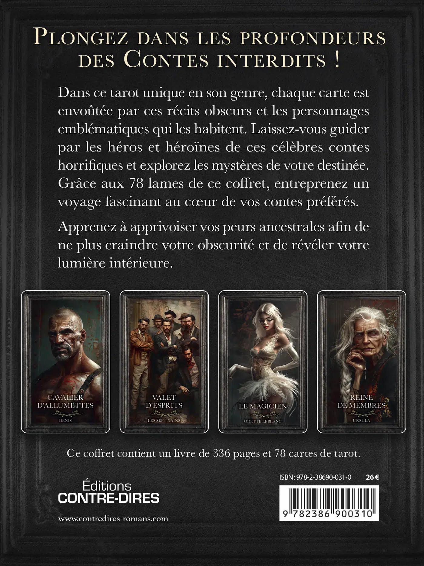 Avec 78 cartes richement illustrées, ce tarot vous invite à entreprendre un voyage fascinant à travers les royaumes de l’inconnu. Osez plonger dans l’obscurité et découvrez ce que le destin vous réserve. De plus, admirez les 38 personnages magnifiquement illustrés tirés des Contes interdits, ajoutant une profondeur et une intrigue supplémentaires à votre expérience de tarot.