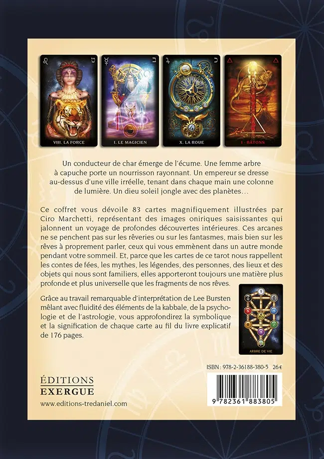 Ce coffret vous dévoile 83 cartes d'enseignement magnifiquement illustrées par Ciro Marchetti, représentant des images oniriques saisissantes qui jalonnent un voyage de profondes découvertes intérieures. Ces arcanes ne se penchent pas sur les rêveries ou sur les fantasmes, mais bien sur les rêves à proprement parler, ceux qui vous emmènent dans un autre monde pendant votre sommeil. Et, parce que les cartes d'enseignement de ce tarot nous rappellent les contes de fées, les mythes, les légendes, des personnes, des lieux et des objets qui nous sont familiers, elles apporteront toujours une matière plus profonde et plus universelle que les fragments de nos rêves.