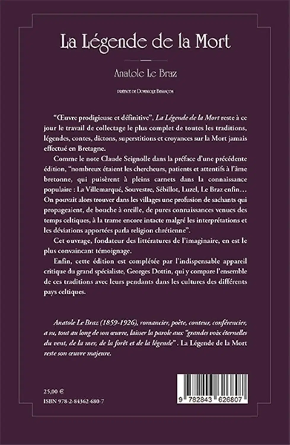 "Œuvre prodigieuse et définitive", La Légende de la Mort reste à ce jour le travail de collectage le plus complet de toutes les traditions, légendes, contes, dictons, superstitions et croyances sur la Mort jamais effectué en Bretagne.