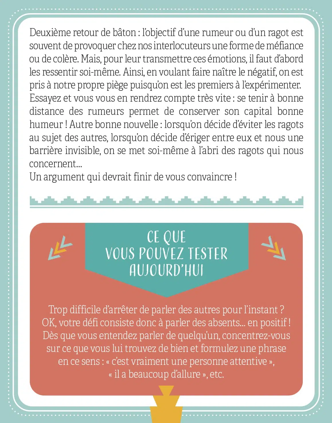 Le plus : des conseils concrets pour aider à l'application de ces principes dans la vie quotidienne (j'arrête de colporter des rumeurs, je laisse passer les émotions négatives, etc.).