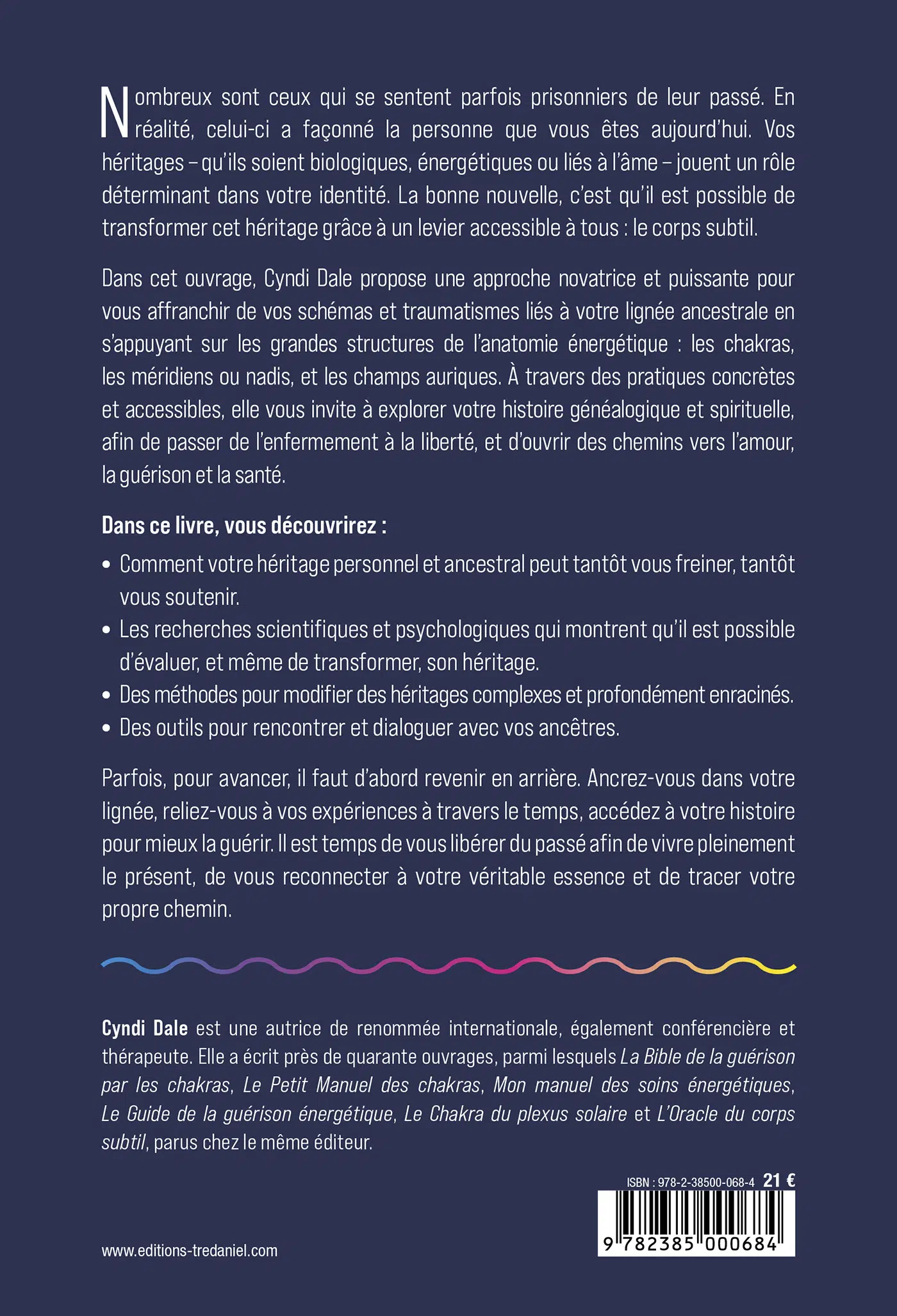 Dans cet ouvrage, Cyndi Dale propose une approche novatrice et puissante pour vous affranchir de vos schémas et traumatismes liés à votre lignée ancestrale en s’appuyant sur les grandes structures de l’anatomie énergétique : les chakras, les méridiens ou nadis, et les champs auriques. À travers des pratiques concrètes et accessibles, elle vous invite à explorer votre histoire généalogique et spirituelle, afin de passer de l’enfermement à la liberté, et d’ouvrir des chemins vers l’amour, la guérison et la santé.