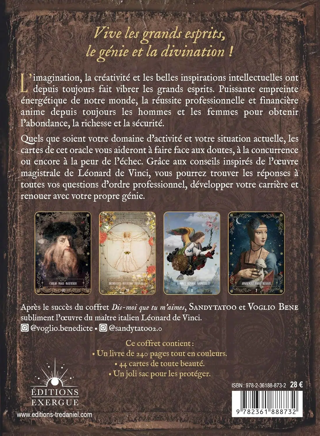 Après le franc succès de leur collaboration pour l’oracle Dis-moi que tu m’aimes, Sandytatoo et Voglio Bene entreprennent ce nouveau projet, rendant hommage à l’un des plus grands génies : Léonard de Vinci. Chaque carte se base sur ses peintures ou croquis, apportant un aspect ancien à l’ensemble, mais toujours retravaillé à la manières streetart si reconnaissable de ces artistes.