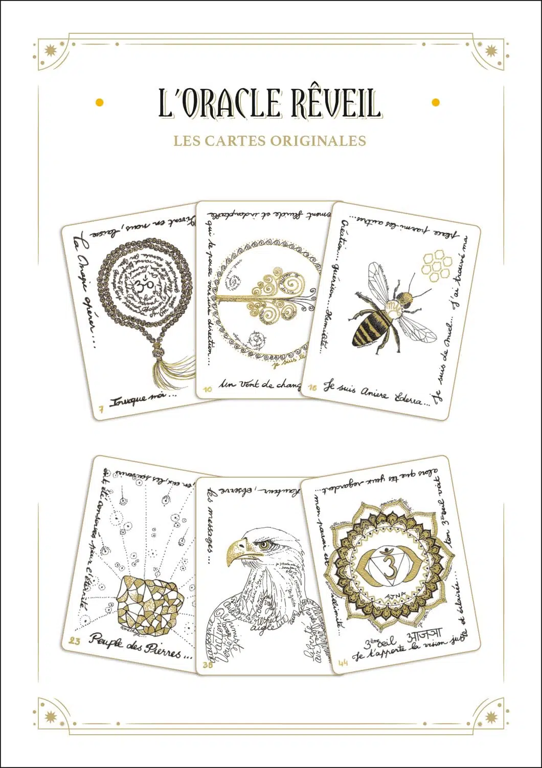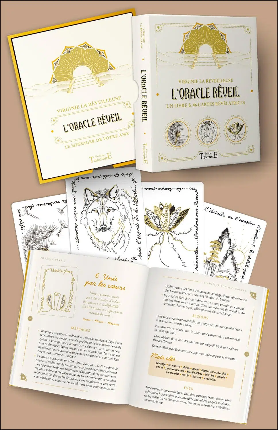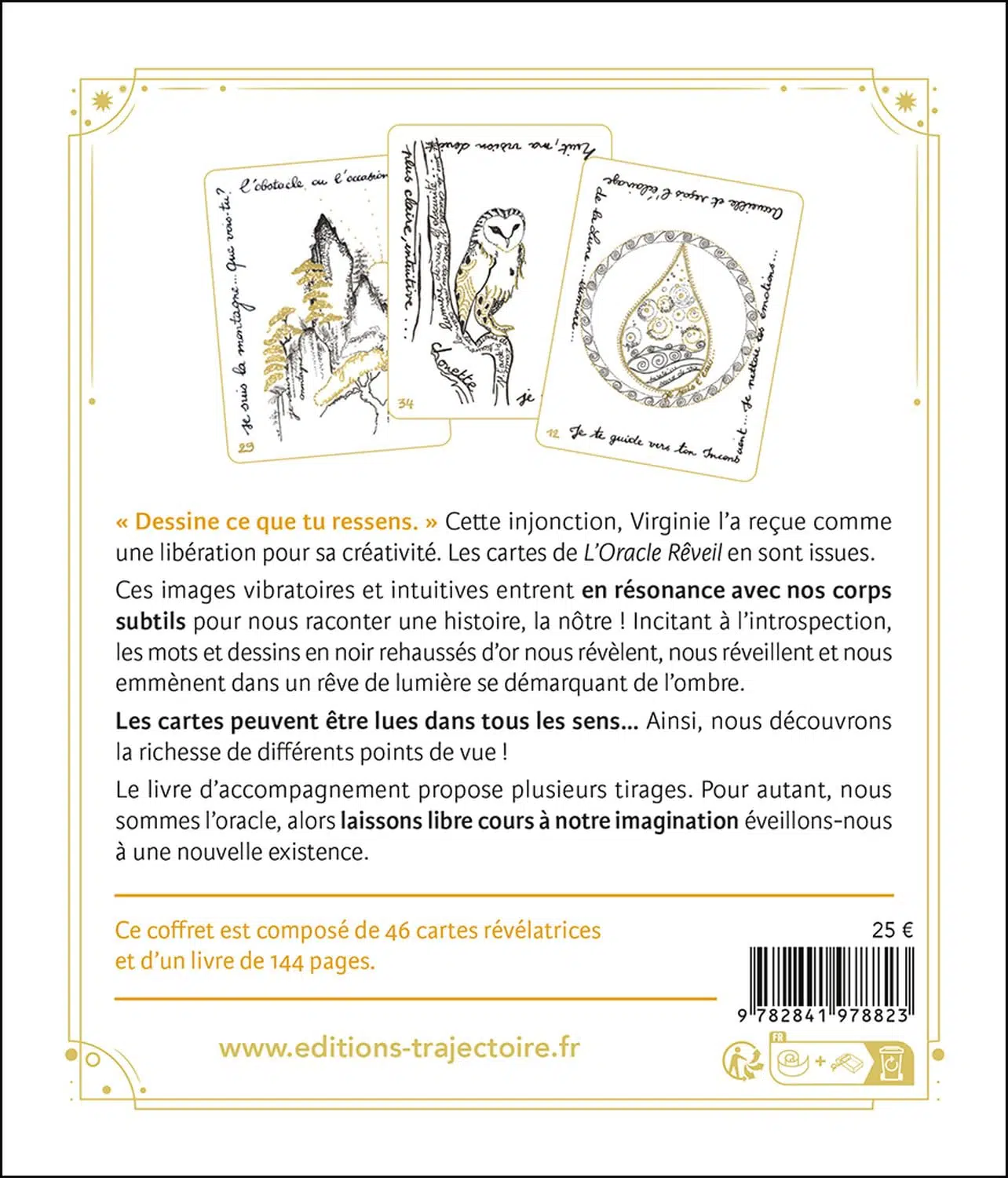"Dessine ce que tu ressens". Cette injonction, Virginie l'a reçue comme une libération pour sa créativité. Les cartes de L'Oracle Rêveil en sont issues. Ces images vibratoires et intuitives entrent en résonance avec nos corps subtils pour nous raconter une histoire, la nôtre ! Incitant à l'introspection, les mots et dessins en noir rehaussés d'or nous révèlent, nous réveillent et nous emmènent dans un rêve de lumière se démarquant de l'ombre.