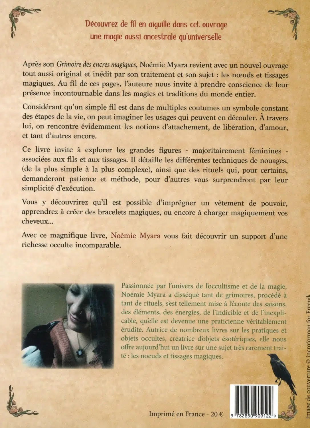 Après le Grimoire des encres magiques, Noémie Myara revient avec un nouvel ouvrage tout aussi original et inédit par son traitement et son sujet. L'auteure, à travers sept chapitres, nous invite à découvrir les symboliques des nœuds et tissages dans différents mythes, traditions et cultures. Elle parcourt les mythes des quatre coins du monde en explorant les grandes figures, majoritairement féminines, associées aux fils et tissages. Elle développe différentes techniques, allant de la plus simple à la plus complexe, afin de nous donner toutes les clés pour employer au mieux cette magie. Elle fait un détour par la numérologie et la magie des couleurs et les matières, afin que nous puissions associer ces diverses symboliques pour un résultat optimal.