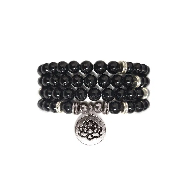 Bracelet Mala à 108 perles sur élastique, avec breloques argentées, d'un tour d'environ 75cm.