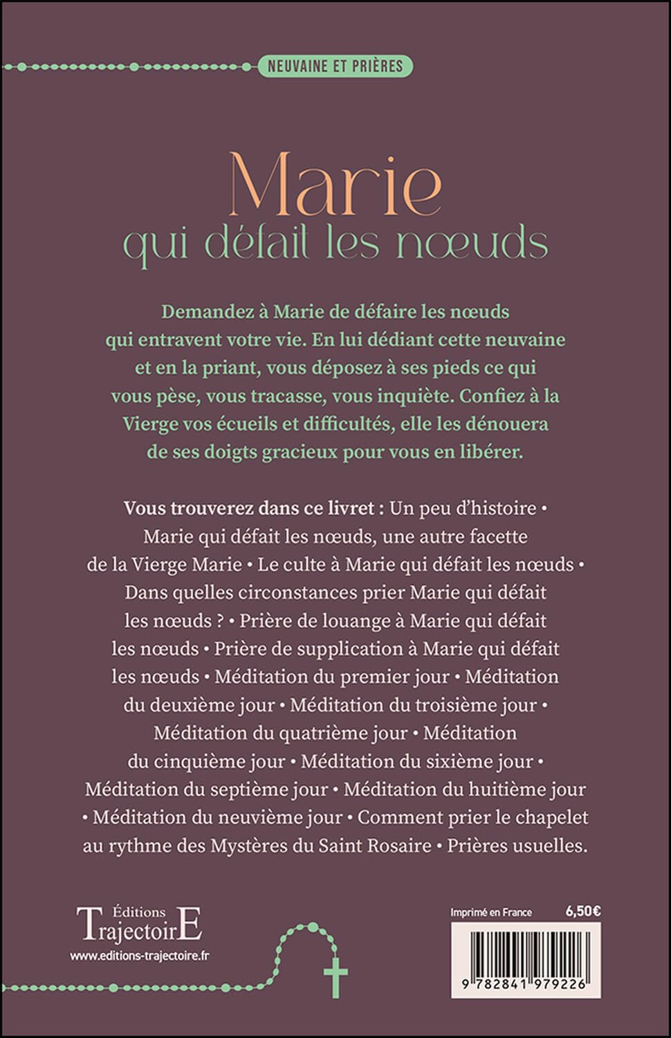 Demandez à Marie de défaire les nœuds qui entravent votre vie. En lui dédiant cette neuvaine et en la priant, vous déposez à ses pieds ce qui vous pèse, vous tracasse, vous inquiète. Confiez à la Vierge vos écueils et difficultés, elle les dénouera de ses doigts gracieux pour vous en libérer.