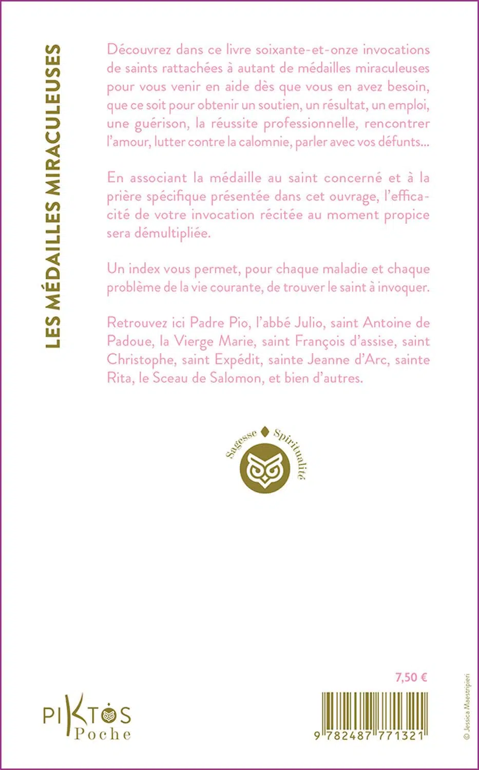 Découvrez dans ce livre soixante-et-onze invocations de saints rattachées à autant de médailles miraculeuses pour vous venir en aide dès que vous en avez besoin, que ce soit pour obtenir un soutien, un résultat, un emploi, une guérison, la réussite professionnelle, rencontrer l’amour, lutter contre la calomnie, parler avec vos défunts…
