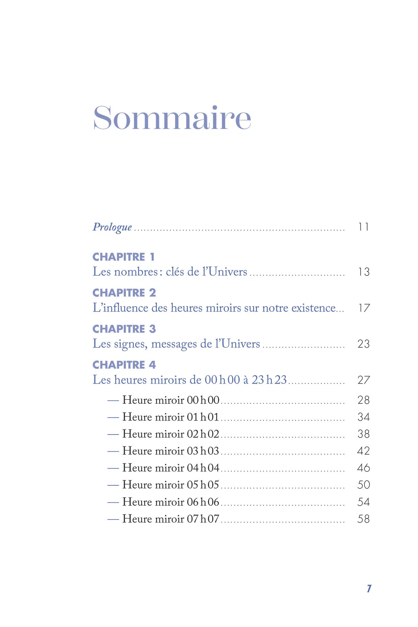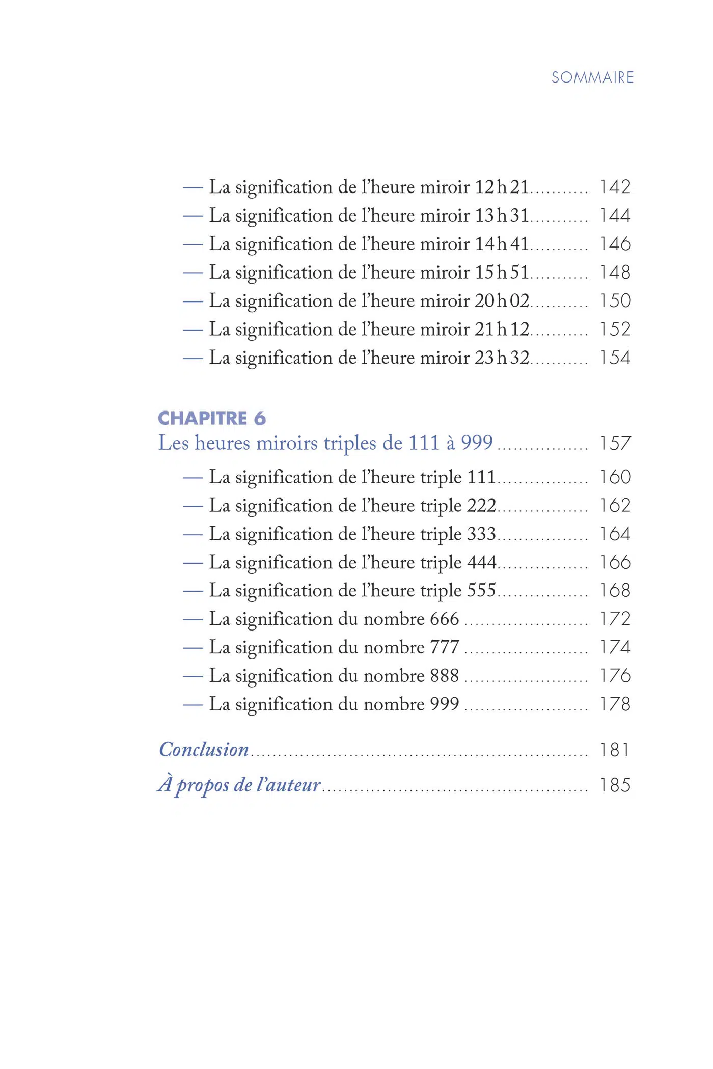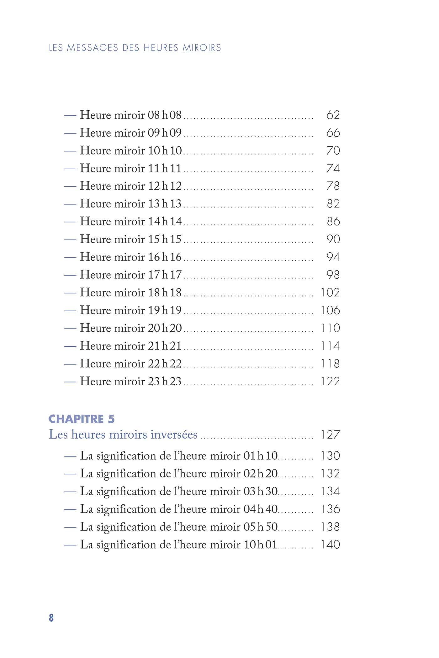 Dans ce livre, vous découvrirez la signification des heures miroirs de 00h00 à 23h23, des heures miroirs inversées de 01h10 à 23h32 et des chiffres triples de 111 à 999.