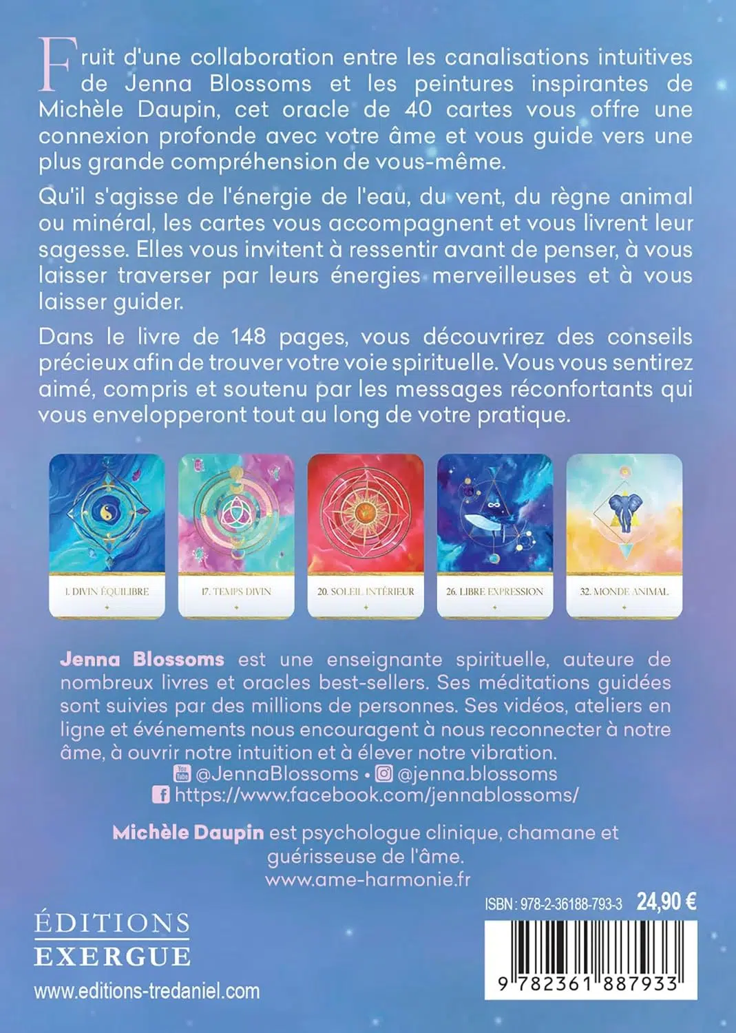 Fruit d'une collaboration entre les canalisations intuitives de Jenna Blossoms et les peintures inspirantes de Michèle Daupin, cet oracle de 40 cartes vous offre une connexion profonde avec votre âme et vous guide vers une plus grande compréhension de vous-même.