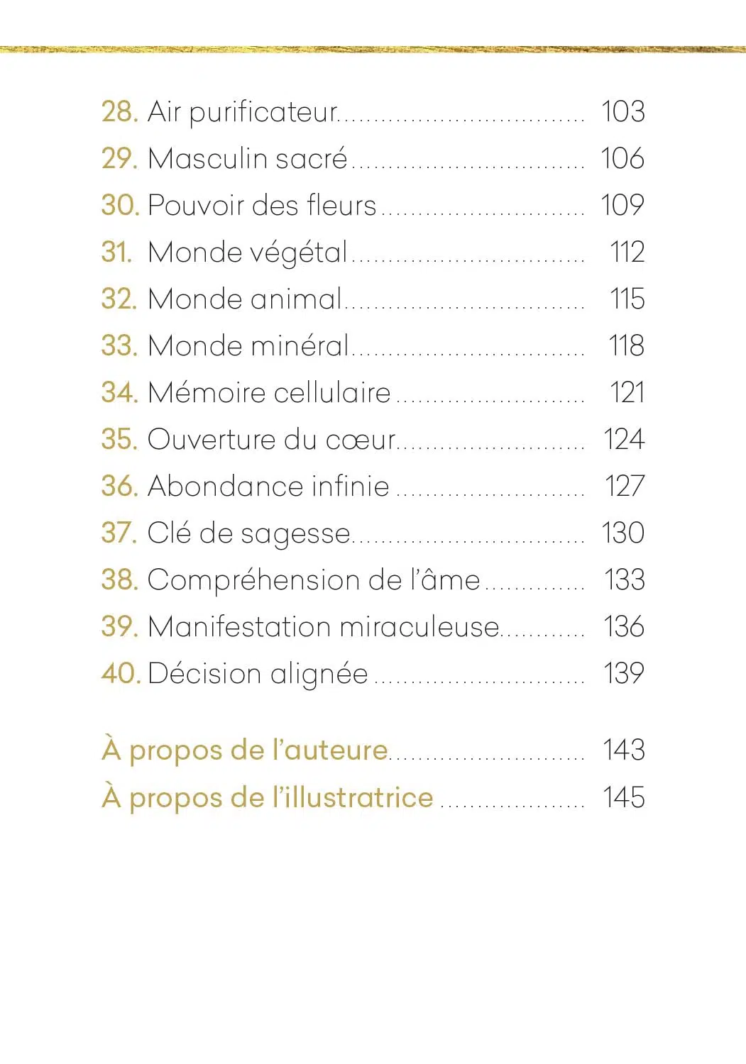 Qu'il s'agisse de l'énergie de l'eau, du vent, du règne animal ou minéral, les cartes vous accompagnent et vous offrent leur sagesse. Elles vous invitent à ressentir avant de penser, à vous laisser traverser par leurs énergies merveilleuses et à vous laisser guider.
