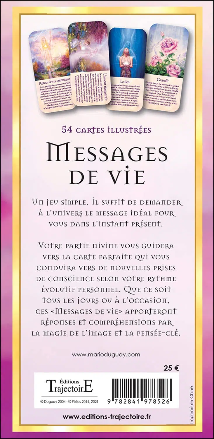 Un jeu simple. Il suffit de demander à l'univers le message idéal pour vous dans l'instant présent. Votre partie divine vous guidera vers la carte parfaite qui vous conduira vers de nouvelles prises de conscience selon votre rythme évolutif personnel. Que ce soit tous les jours ou à l'occasion, ces "Messages de vie" apporteront réponses et compréhension par la magie de l'image et la pensée-clé.