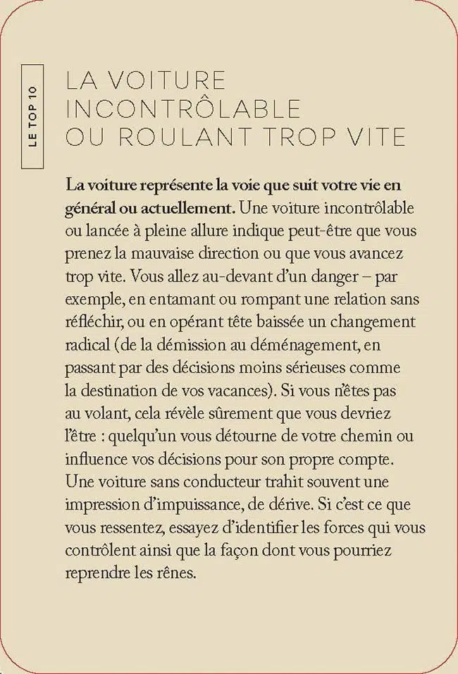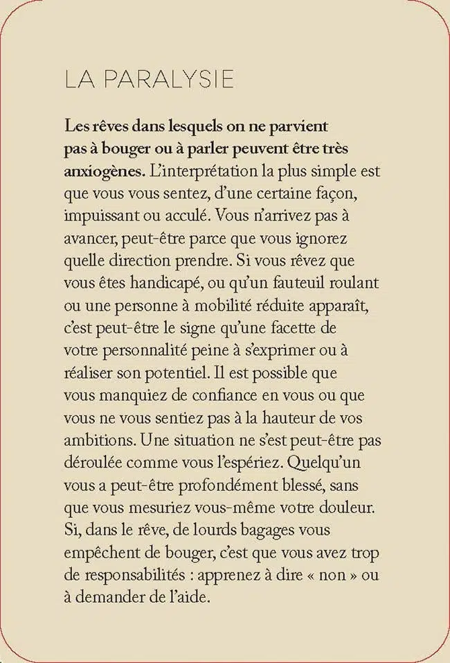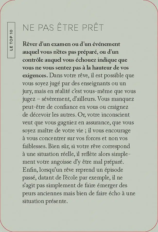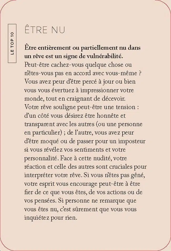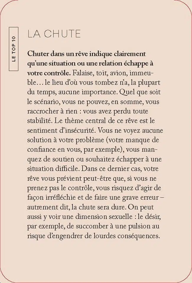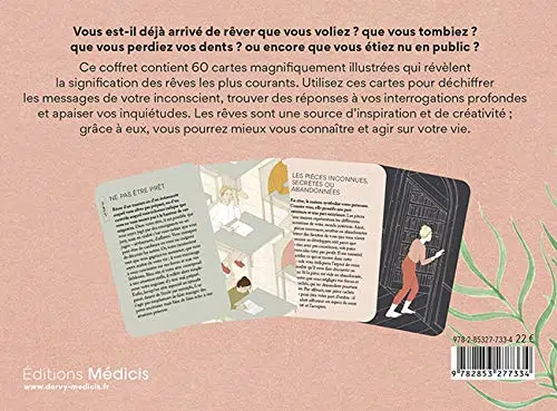 Un magnifique coffret pour décrypter les messages des rêvesVous est-il déjà arrivé de rêver que vous voliez ? Que vous perdiez vos dents ? Que vous tombiez ? Ou encore que vous étiez nu en public ? Ce coffret contient 60 cartes magnifiquement illustrées qui révèlent la signification des rêves les plus courants. Ces cartes permettent de déchiffrer les messages de son inconscient, trouver des réponses à ses interrogations profondes et apaiser ses inquiétudes. Les rêves sont une source d'inspiration et de créativité ; grâce à eux, nous pourrons mieux nous connaître et agir sur notre vie.