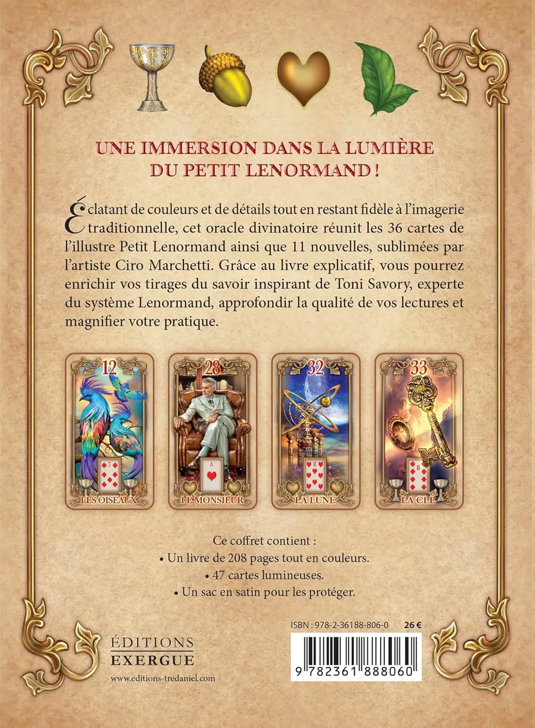 Un Petit Lenormand revisité par l'artiste Ciro Marchetti, et augmenté de 11 nouvelles cartes magnifiquement illustrées.Une immersion dans la lumière du Petit Lenormand !Éclatant de couleurs et de détails tout en restant fidèle à l'imagerie traditionnelle, cet oracle divinatoire réunit les trente-six cartes de l'illustre Petit Lenormand à onze nouvelles cartes sublimées par l'artiste Ciro Marchetti. Grâce au livre d'accompagnement tout en couleur, vous pourrez enrichir vos tirages du savoir inspirant de Toni Savory, une experte du système Lenormand, approfondir la qualité de vos lectures et magnifier votre pratique.