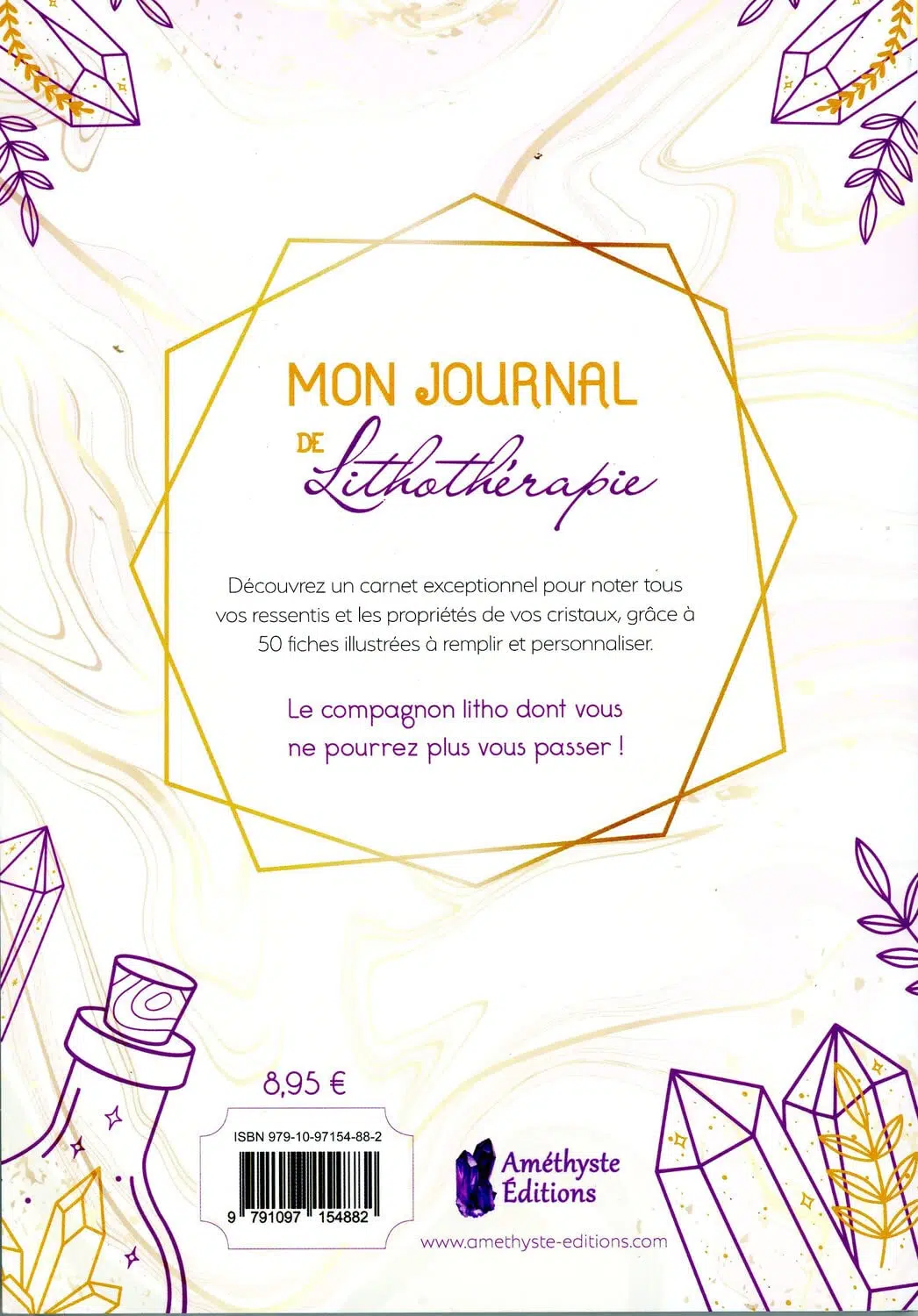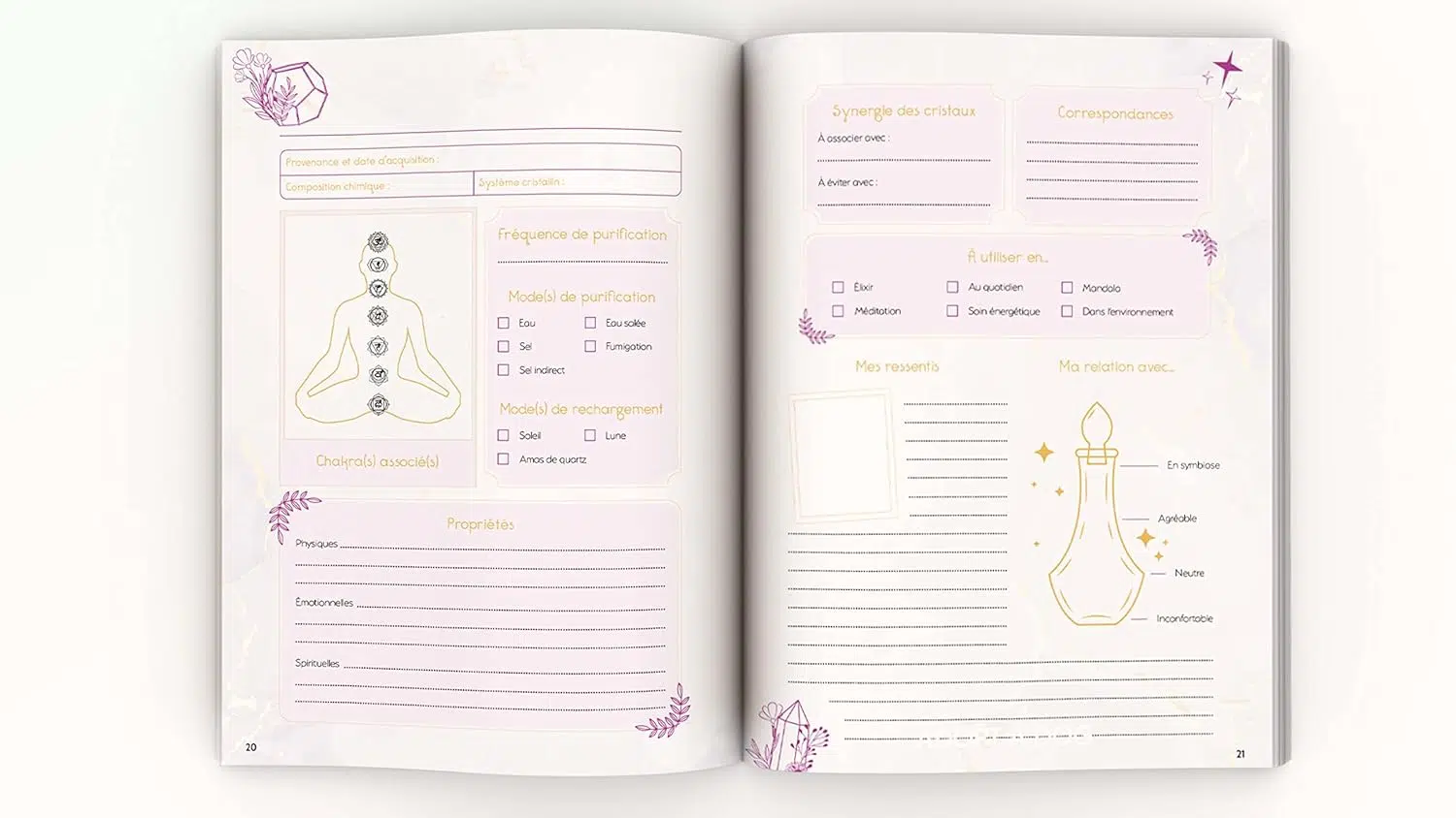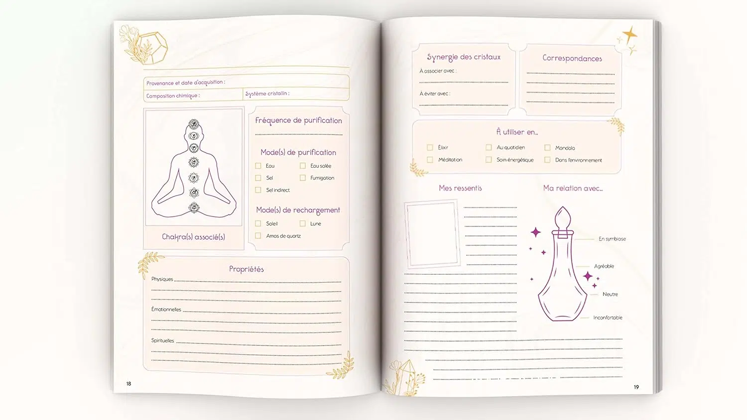 Enfin un journal de litho à votre image. Mon journal de lithothérapie est le compagnon indispensable pour tout passionné de cristaux. Avec ses cinquante fiches à remplir, il deviendra un outil précieux pour garder un suivi de votre collection et noter toutes vos expériences. Propriétés de chaque cristal, chakras associés, synergies, correspondances, fréquence de purification, ressentis personnels...