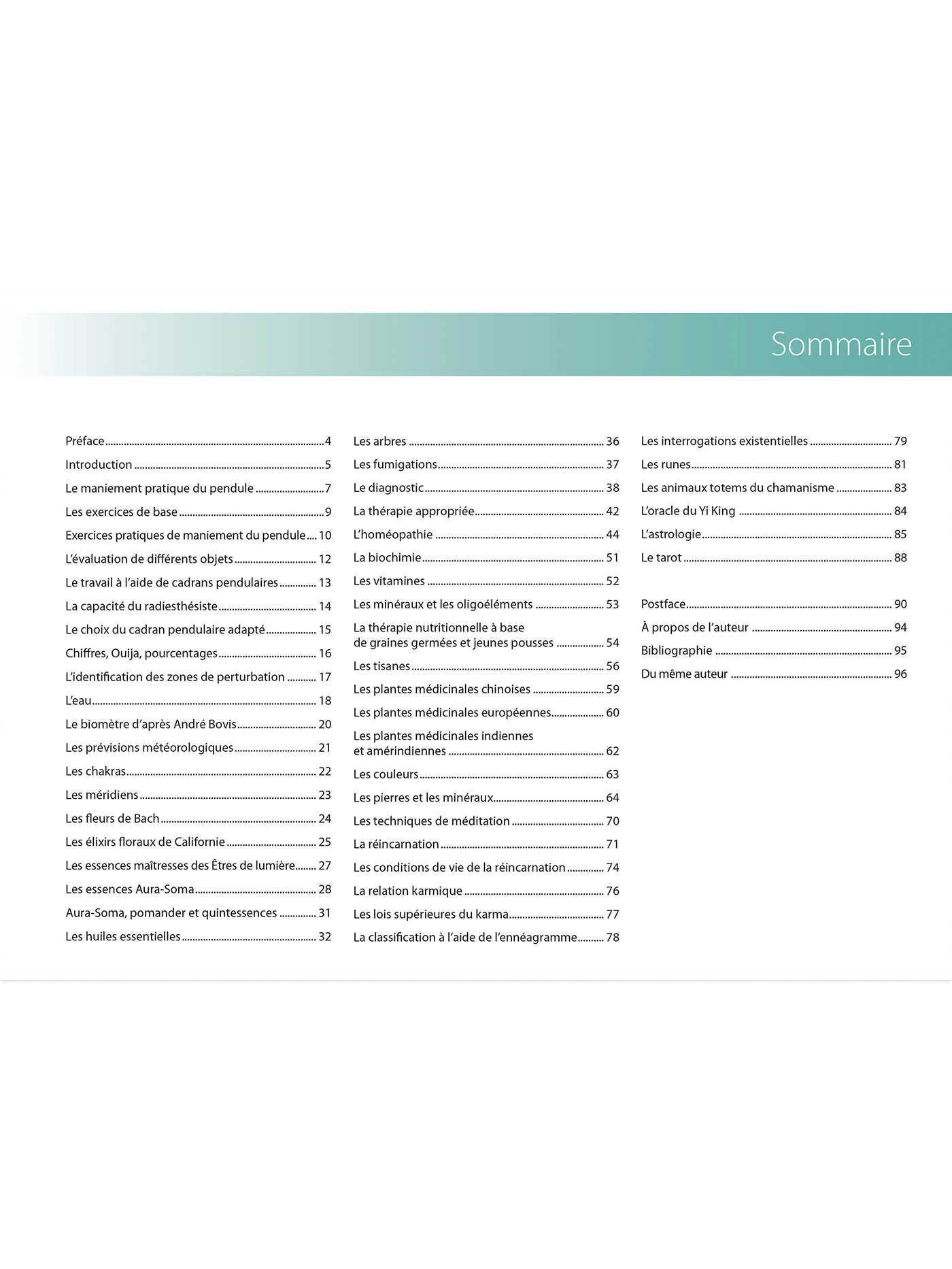 Découvrez dans ce guide pratique 150 planches aux thématiques variées : chakras, astrologie, huiles essentielles, tarot, animaux totems ou pierres thérapeutiques… Ce livre de référence propose également des exercices pratiques de maniement du pendule, permettant aux radiesthésistes débutants et confirmés d’en retirer le plus grand bénéfice.
