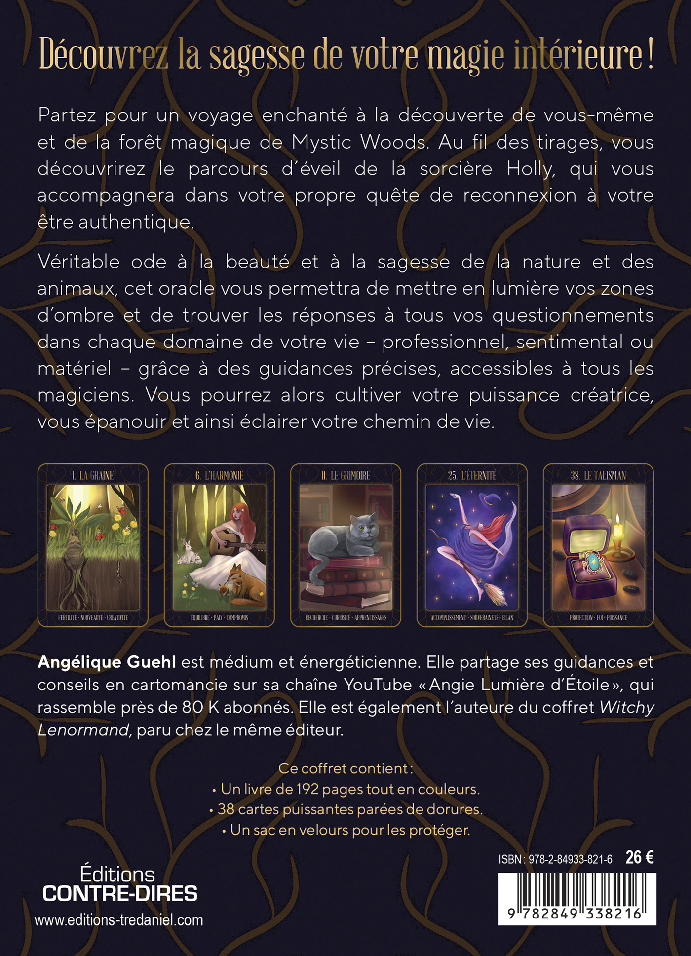 Partez pour un voyage enchanté à la découverte de vous-même et de la forêt magique de Mystic Woods. Au fil des tirages, vous découvrirez le parcours d’éveil de la sorcière Holly, qui vous accompagnera dans votre propre quête de reconnexion à votre être authentique.