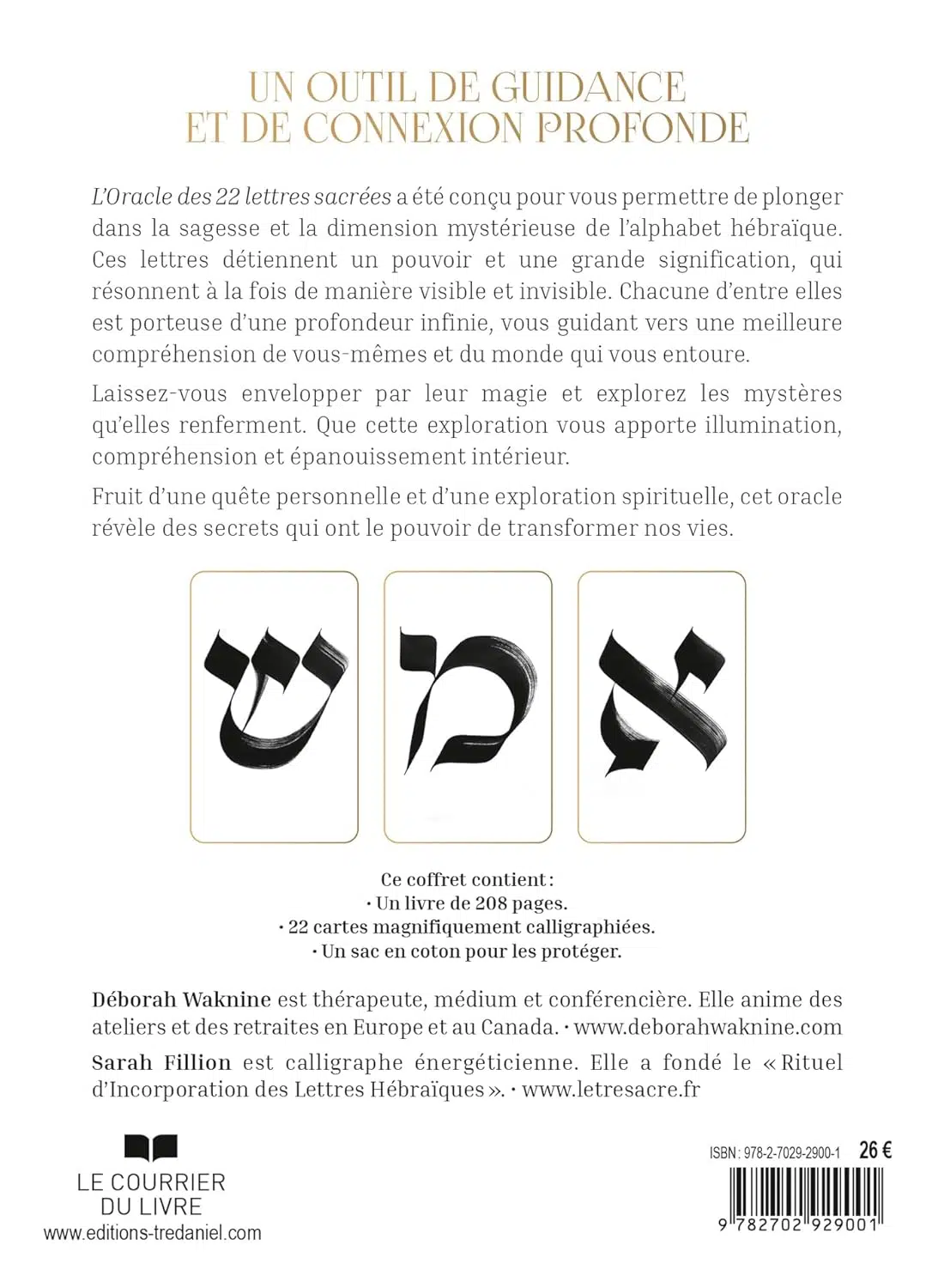 L'Oracle des 22 Lettres sacrées, un outil de guidance et de connexion profonde. Fruit d'une quête personnelle et d'une exploration spirituelle, il révèle les secrets des lettres sacrées hébraïques qui ont le pouvoir de transformer nos vies.L'Oracle des 22 lettres sacrées a été conçu pour vous permettre de plonger dans la sagesse et la dimension mystérieuse de ces lettres sacrées. Chacune d'entre elles détient un pouvoir et une grande signification, qui résonnent à la fois de manière visible et invisible. Ces lettres sont porteuses d'une profondeur infinie, nous guidant vers une meilleure compréhension de nous-mêmes et du monde qui nous entoure. L'Oracle des 22 lettres sacrées nous invite à revenir dans notre corps, notre cœur et notre présence. C'est à travers cette connexion profonde que nous pouvons véritablement découvrir et nous connecter à la sagesse qu'elles renferment.
