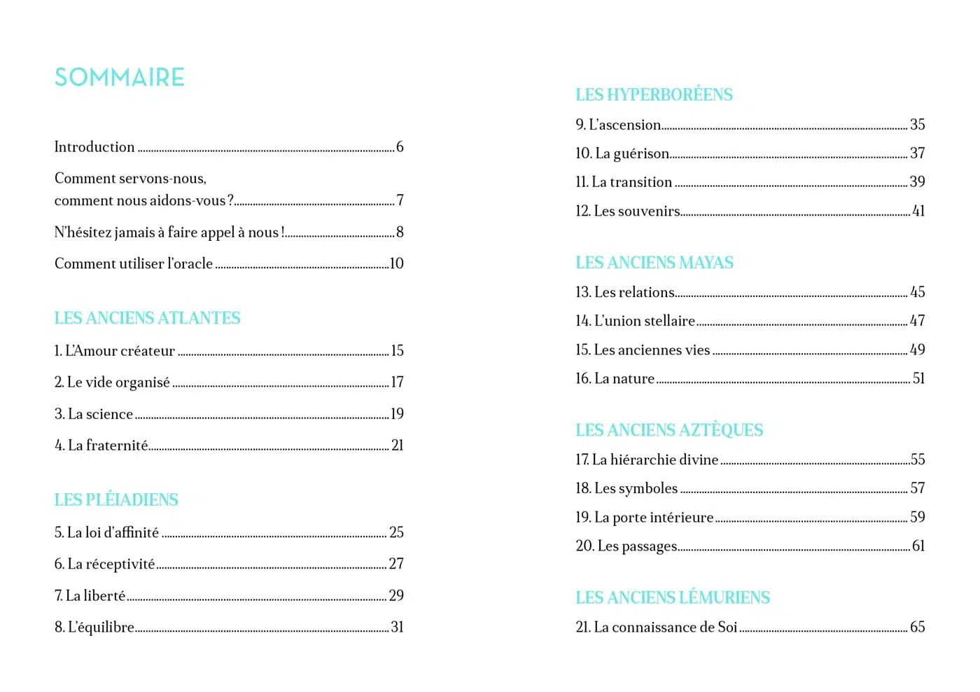 Lulumineuse entretient une connexion régulière aves ces peuples. Entièrement canalisé, cet oracle délivre les messages des anciens Atlantes, des Pléiadiens, des Anciens Mayas, des Anciens Aztèques... qui ont élu domicile au creux de la Terre et qui font partie d’une Alliance au service de l’Amour.