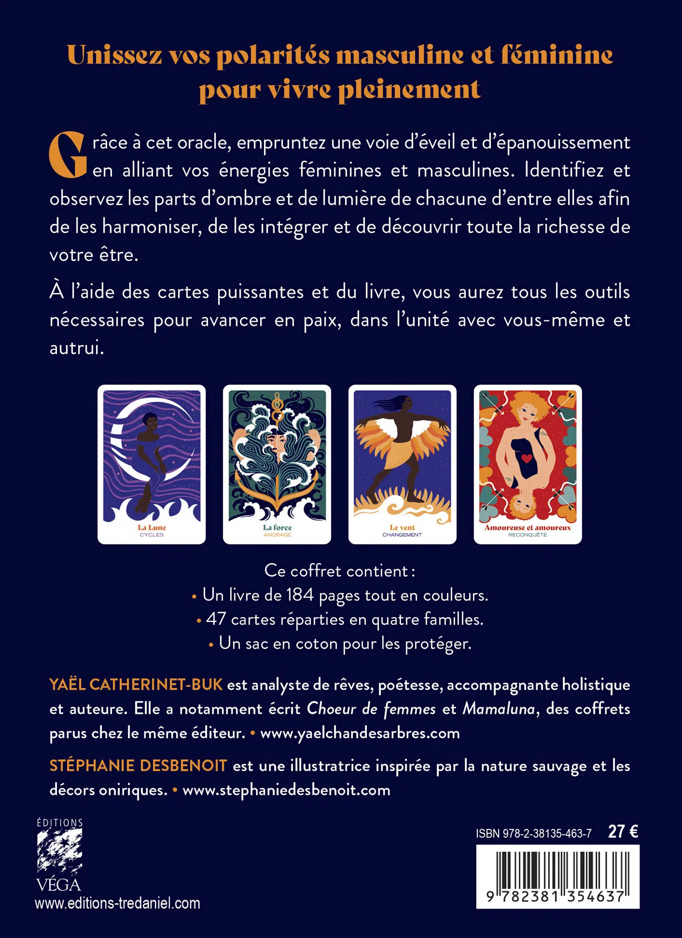 Grâce à cet oracle, empruntez une voie d’éveil et d’épanouissement en alliant les énergies féminines et masculines qui vous composent. Identifiez et observez les parts d’ombre et de lumière de chacune d’entre elles afin de les harmoniser, de les intégrer et de découvrir toute la richesse de votre être.