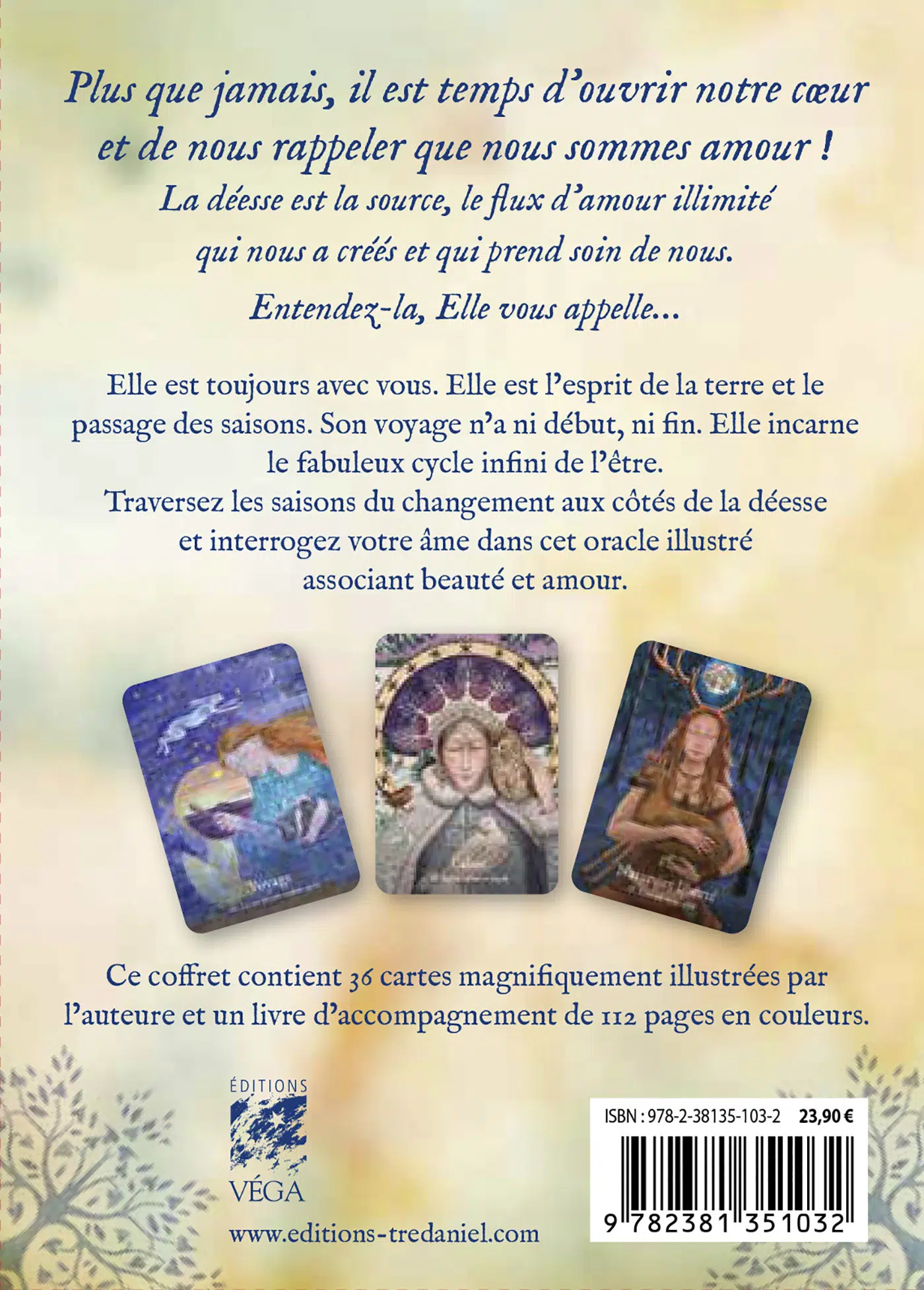 Elle est toujours avec vous. Elle est l’esprit de la terre et le passage des saisons. Son voyage n’a ni début, ni fin. Elle incarne le fabuleux cycle infini de l’être. Traversez les saisons du changement aux côtés de la déesse et interrogez votre âme dans cet oracle illustré associant beauté et amour.