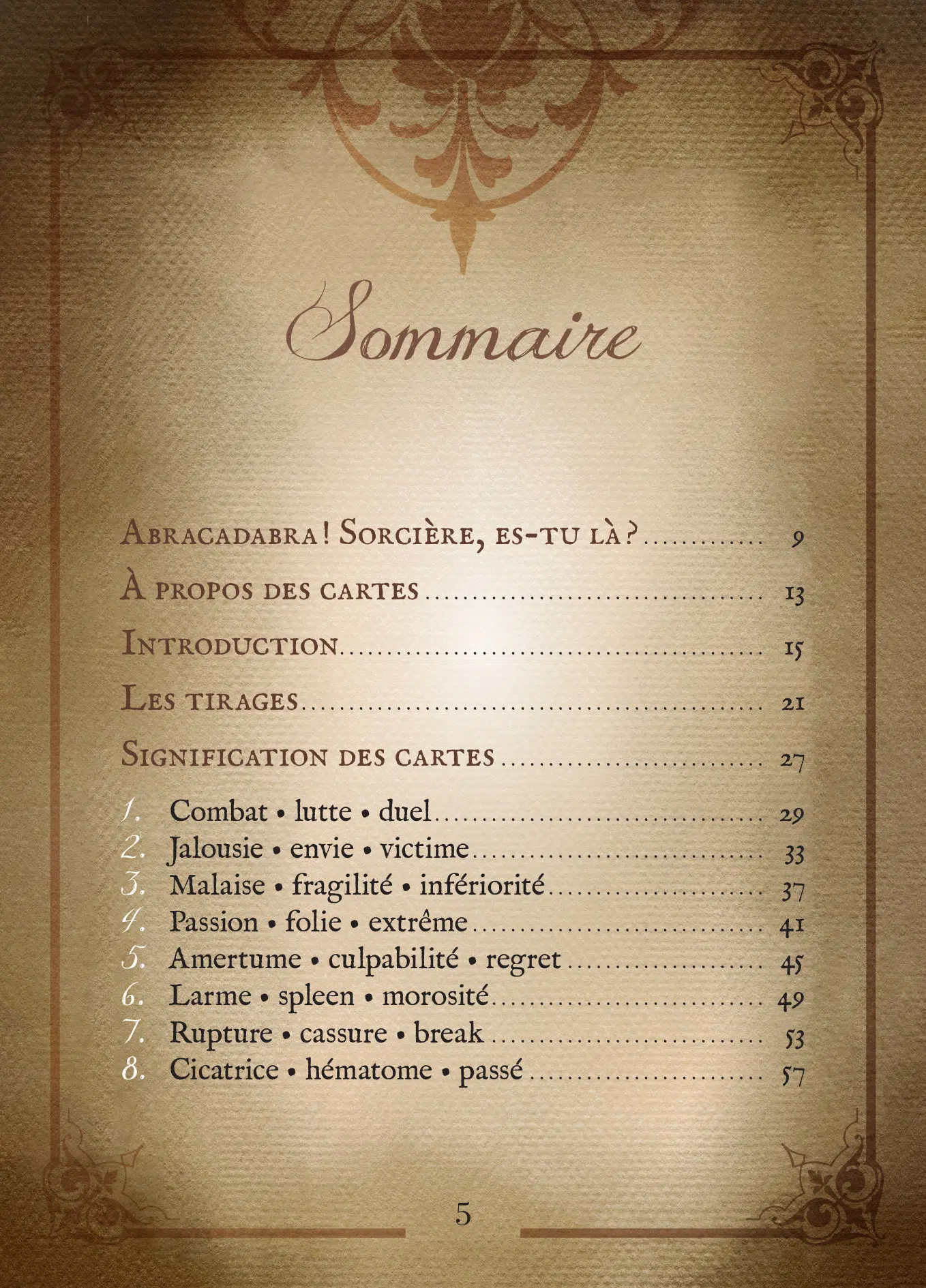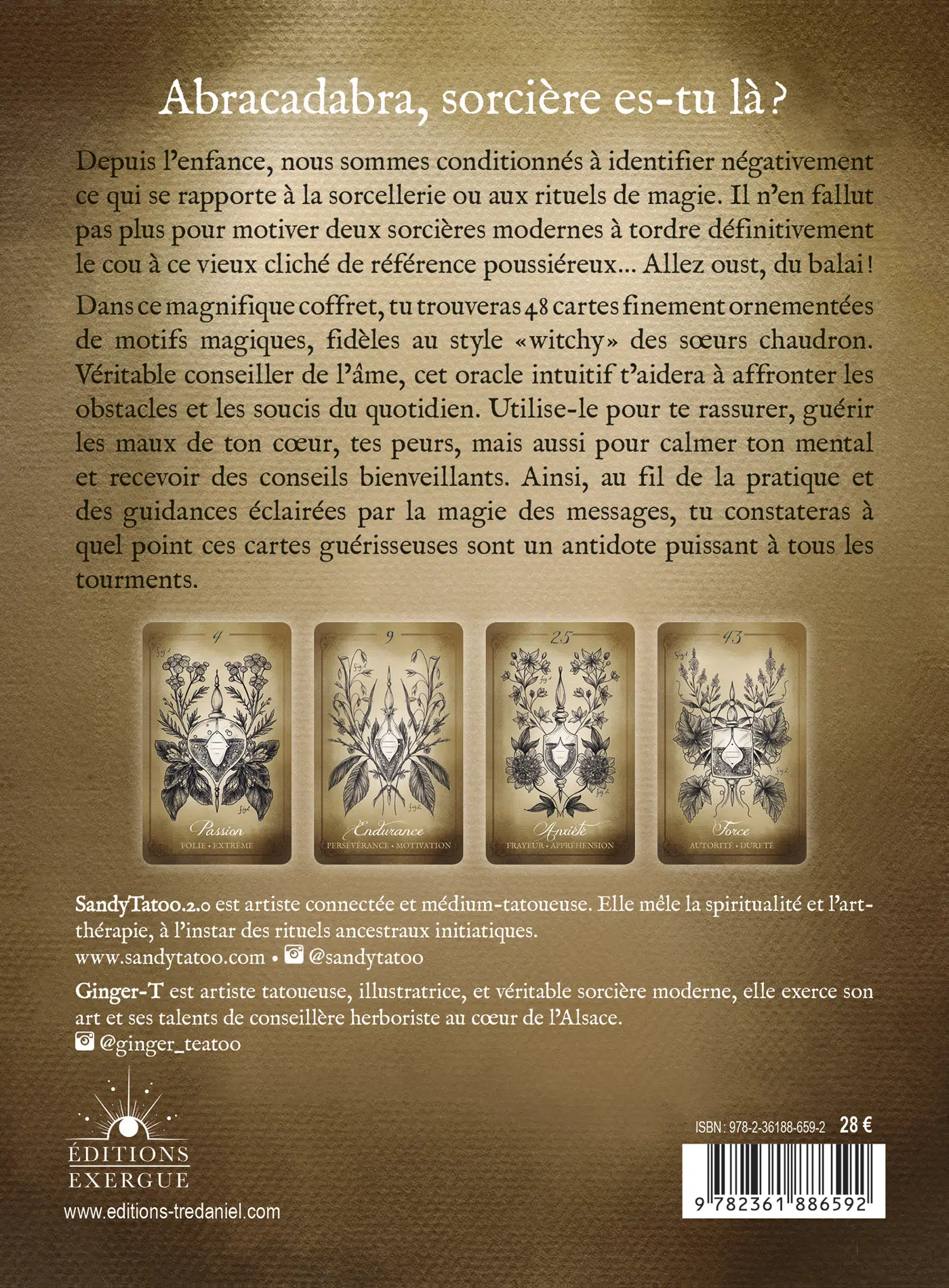 Dans ce magnifique coffret, tu trouveras 48 cartes finement ornementées de motifs magiques, fidèles au style « witchy » des sœurs chaudron. Véritable conseiller de l’âme, cet oracle intuitif t’aidera à affronter les obstacles et les soucis du quotidien. Utilise-le pour te rassurer, guérir les maux de ton cœur, tes peurs, mais aussi pour calmer ton mental et t’apporter des conseils bienveillants. À chaque problème, tu recevras une guidance éclairée à travers la magie des messages. Au fil de la pratique, tu pourras constater à quel point ces cartes guérisseuses sont un antidote puissant à tous les tourments.
