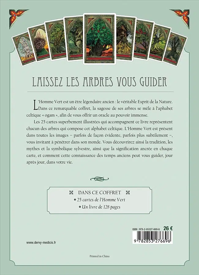 Les 25 cartes d'enseignement superbement illustrées qui accompagnent ce livre représentent chacun des arbres qui compose cet alphabet celtique. L’Homme Vert est présent dans toutes les images – parfois de façon évidente, parfois plus subtilement –, vous invitant à pénétrer dans son monde. Vous découvrirez ainsi la tradition, les mythes et la symbolique sylvestre, ainsi que la signification ancrée en chaque carte, et comment cette connaissance des temps anciens peut nous guider, jour après jour, dans notre vie.