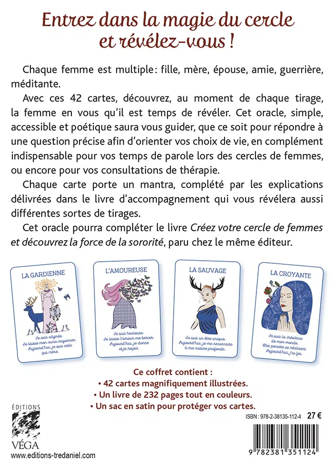 Avec ces 42 cartes, découvrez, au moment de chaque tirage, la femme en vous qu’il est temps de révéler. Cet oracle, simple, accessible et poétique saura vous guider, que ce soit pour répondre à une question précise afin d’orienter vos choix de vie, en complément indispensable pour vos temps de parole lors des cercles de femmes, ou encore pour vos consultations de thérapie.