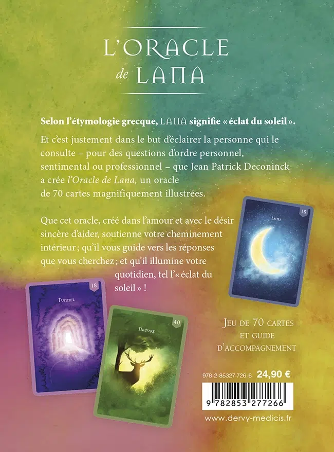Et c’est justement dans le but d’éclairer la personne qui le consulte pour des questions d’ordre personnel, sentimental ou professionnel que Jean Patrick Deconinck a crée l’Oracle de Lana, un oracle de 70 cartes d'enseignement magnifiquement illustrées.