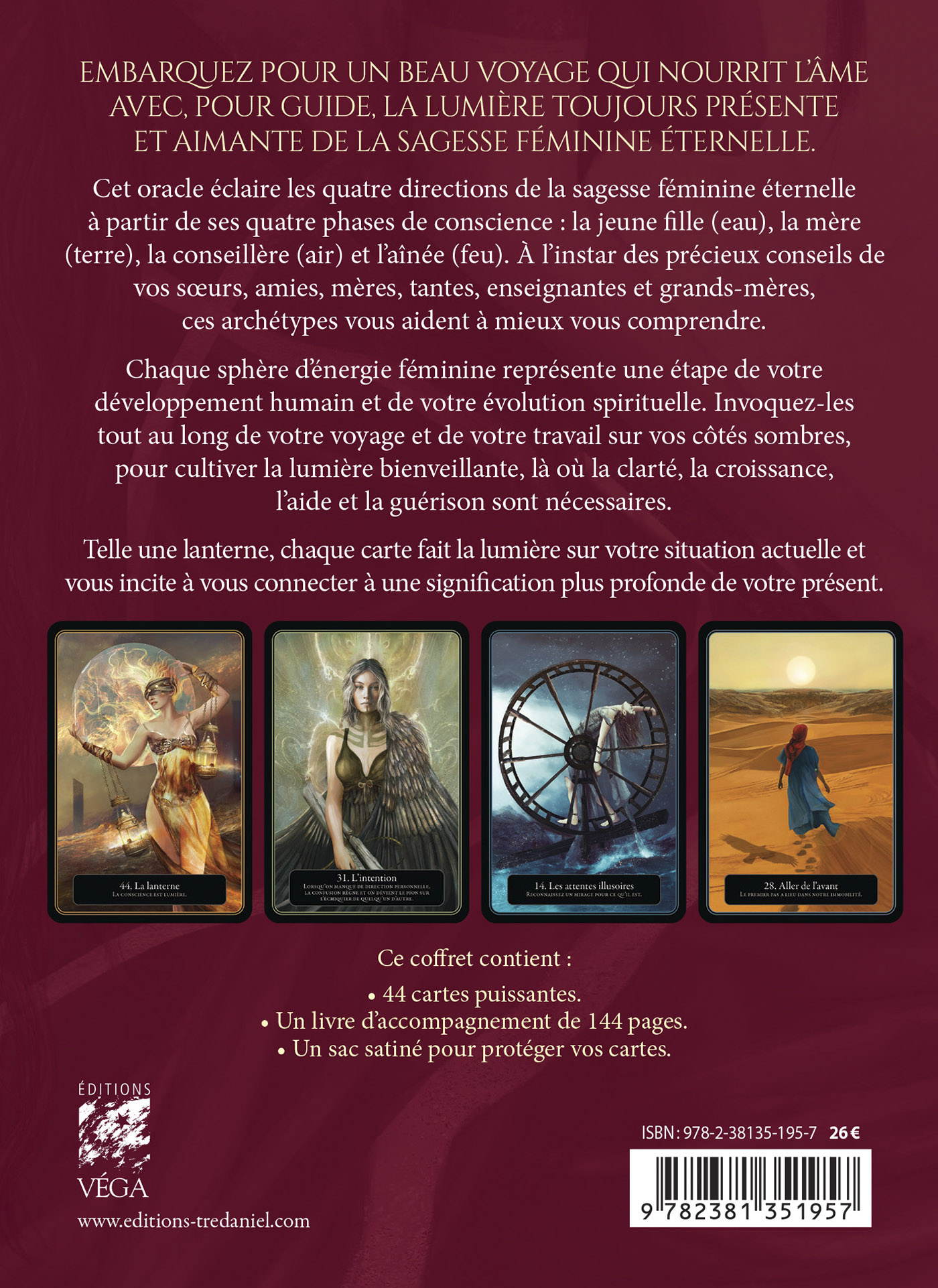 Cet oracle éclaire les quatre directions de la sagesse féminine éternelle à partir de ses quatre phases de conscience : la jeune fille (eau), la mère (terre), la conseillère (air) et l’aînée (feu). À l’instar des précieux conseils de vos sœurs, amies, mères, tantes, enseignantes et grands-mères, ces archétypes vous aident à mieux vous comprendre.