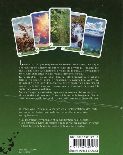 L’Oracle de la Nature, illustré par de très belles photos de la nature (paysages, animaux), est présenté dans un coffret contenant 25 cartes agréables à manipuler et 1 livret de 64 pages qui comprend :