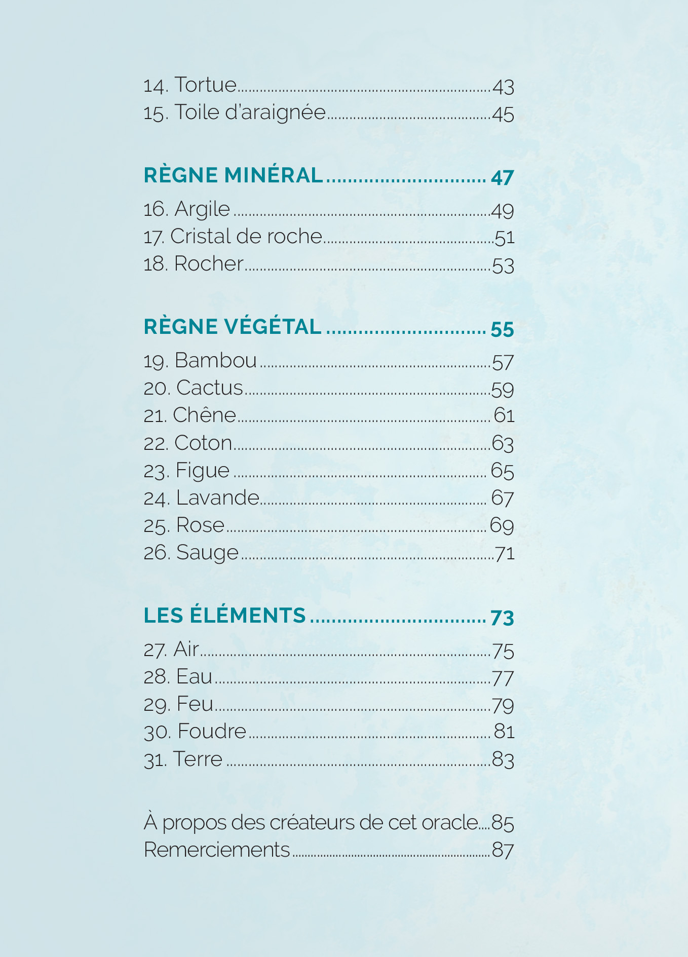 Laissez-vous guider par les 31 cartes de cet oracle et recevez les messages bienveillants du règne animal, végétal, minéral et des quatre éléments. Reconnectez-vous en douceur à notre Terre-Mère dans tout ce qu’elle a de généreux et honorez-la.