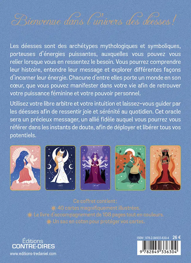 Utilisez votre libre arbitre et votre intuition et laissez-vous guider par les déesses afin de ressentir joie et sérénité au quotidien. Cet oracle sera un précieux messager, un allié fidèle auquel vous pourrez vous référer dans les instants de doute, afin de déployer et libérer tous vos potentiels.