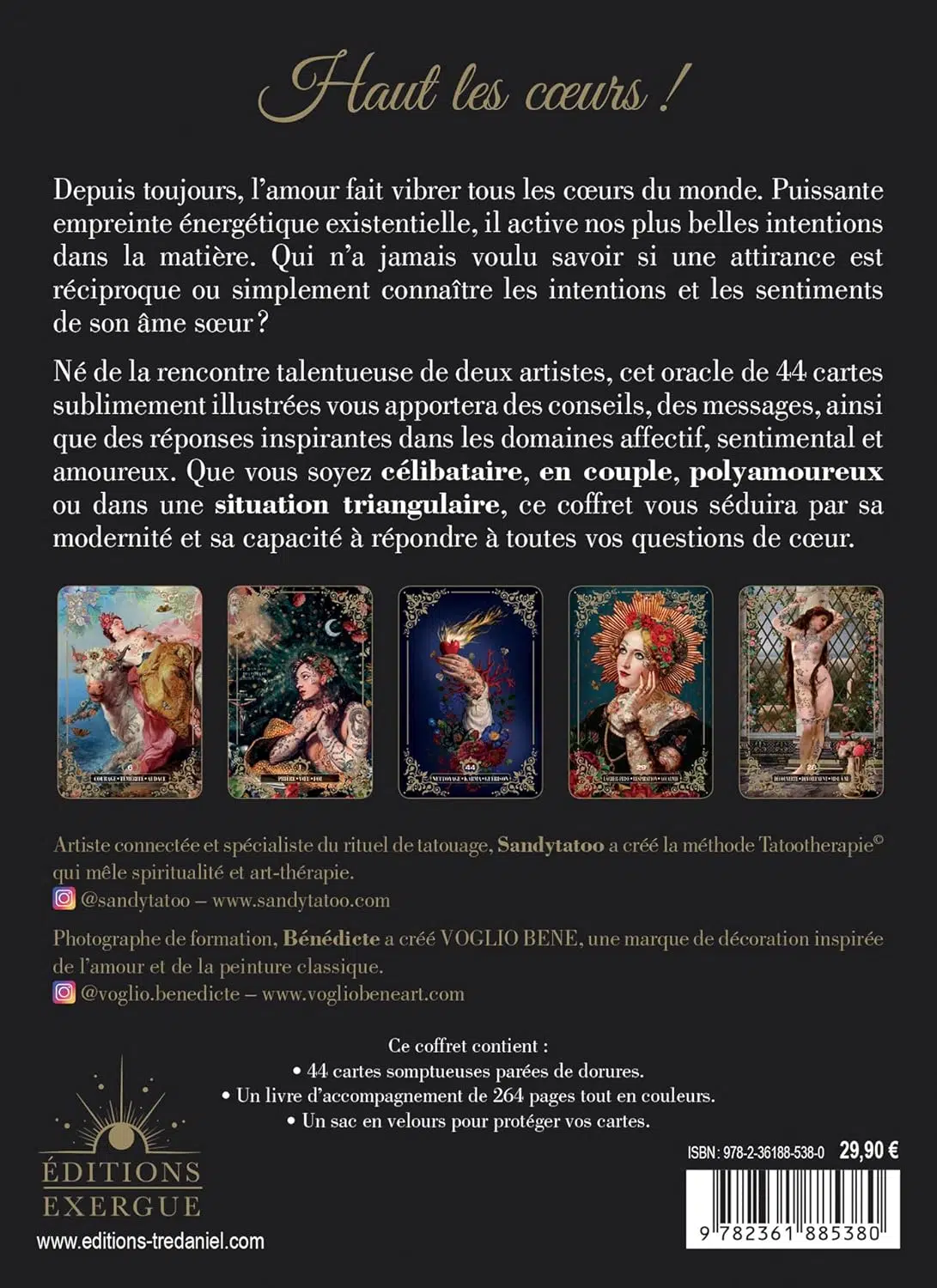 C’est en premier lieu son look unique qui démarque ce jeu des autres. Mêlant habilement le street art et le style classique des peintures italiennes, chaque carte évoque à la fois les anciennes romances et notre monde d’aujourd’hui. Comme son nom l’indique, il axe ses guidances et prédictions autour de la sphère sentimentale et amoureuse. Mais ses messages ne se limitent pas pour autant, car ses mots clés restent adaptables à différents thèmes. La richesse des images permet aussi à l’intuition de se laisser inspirer par ses détails, dans une ambiance énigmatique et sensuelle.