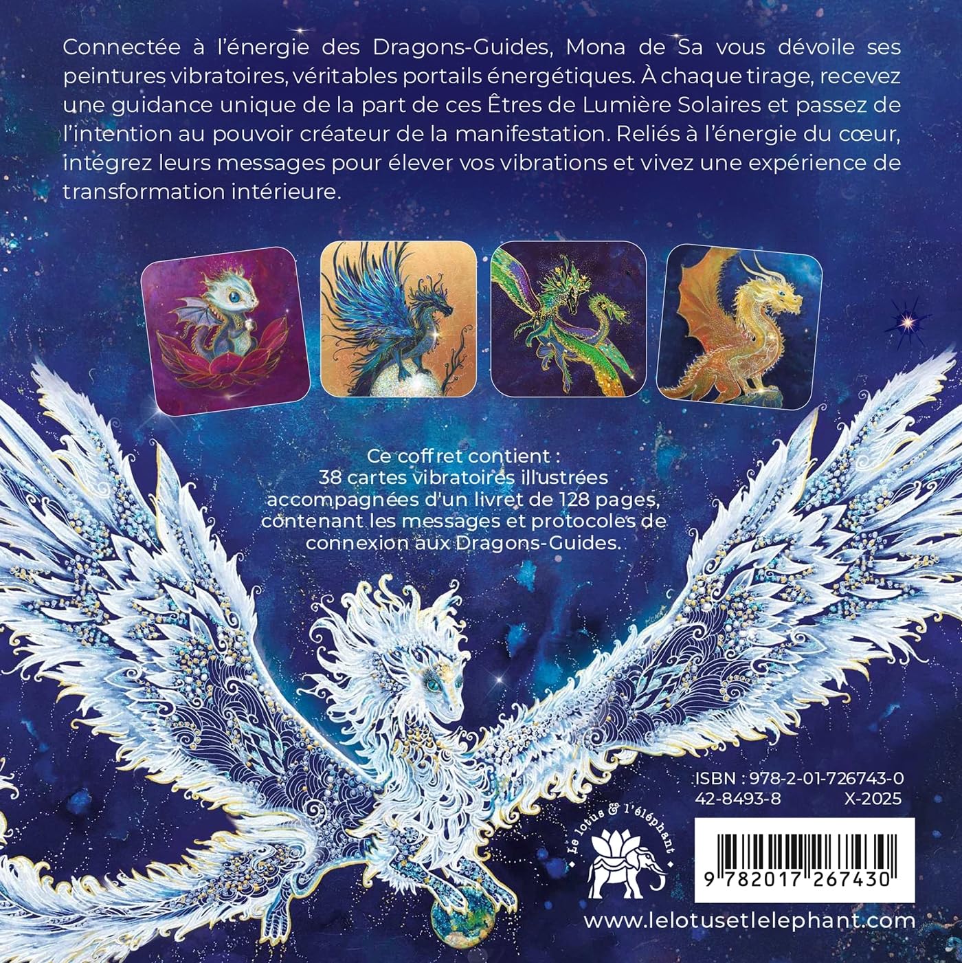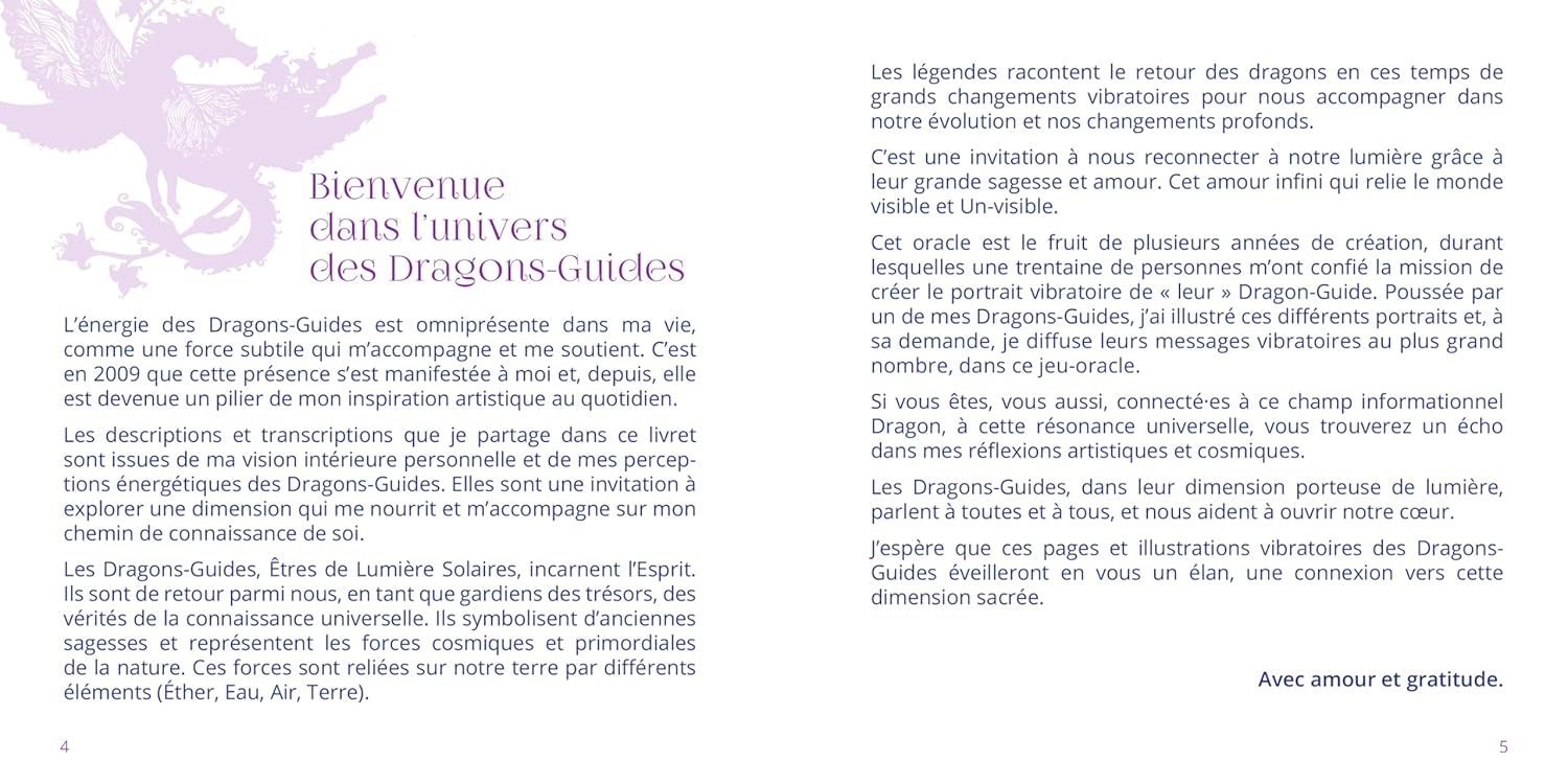 Ce coffret contient 38 cartes vibratoires illustrées accompagnées d'un livret de 128 pages, contenant les messages et protocoles de connexion aux Dragons-Guides.