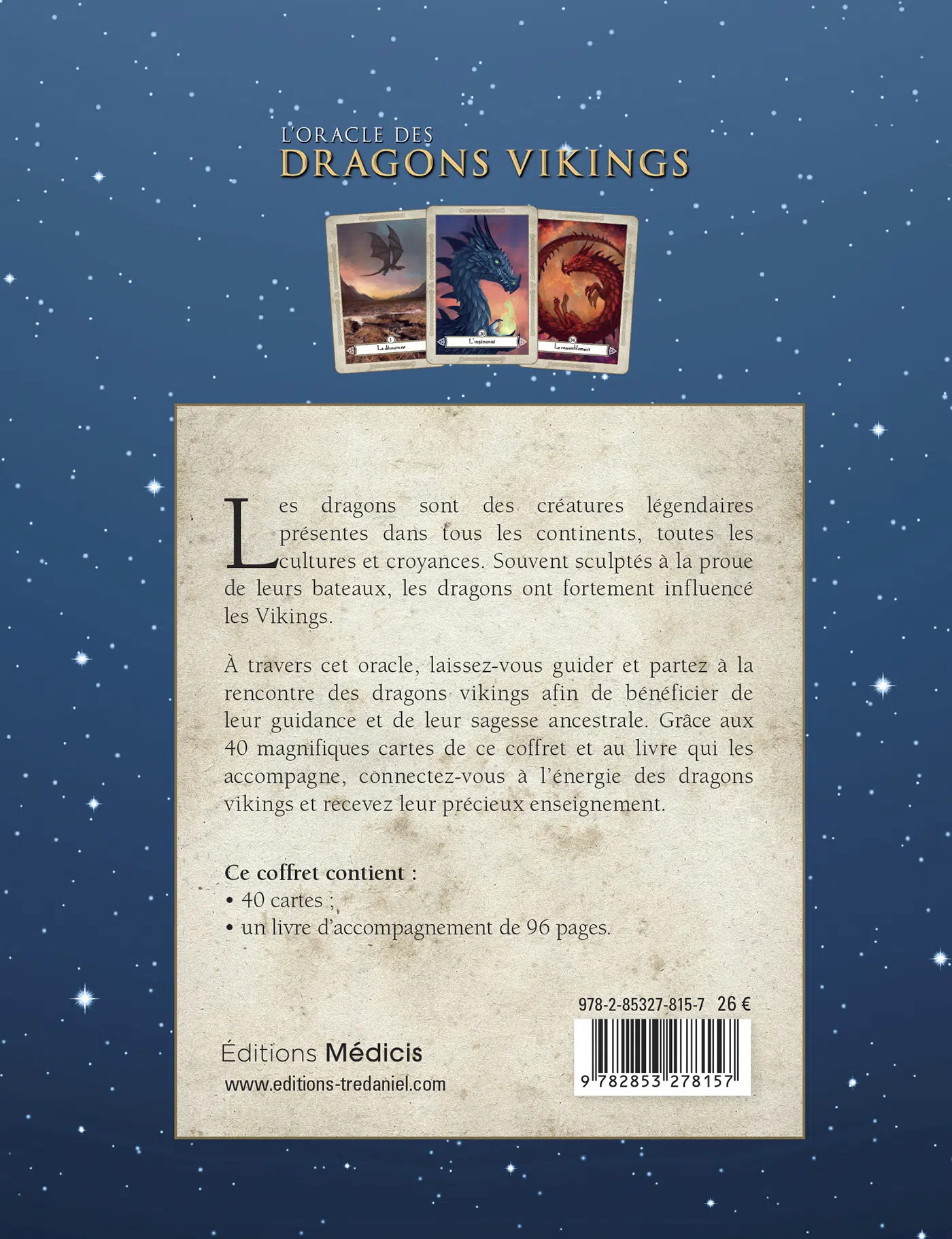 À travers cet oracle, laissez-vous guider et partez à la rencontre des dragons vikings afin de bénéficier de leur guidance et de leur sagesse ancestrale. Grâce aux 40 magnifiques cartes d'enseignement de ce coffret et au livre qui les accompagne, connectez-vous à l’énergie des dragons vikings et recevez leur précieux enseignement.