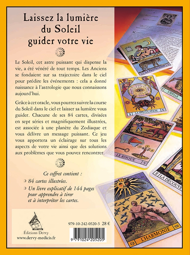 Grâce à cet oracle, vous pourrez suivre la course du Soleil dans le ciel et laisser sa lumière vous guider. Chacune de ses 84 cartes, divisées en sept séries et magnifiquement illustrées, est associée à une planète du Zodiaque et vous délivre un message puissant. Ce jeu vous apportera un éclairage sur tous les aspects de votre vie ainsi que des solutions aux problèmes que vous pouvez rencontrer.