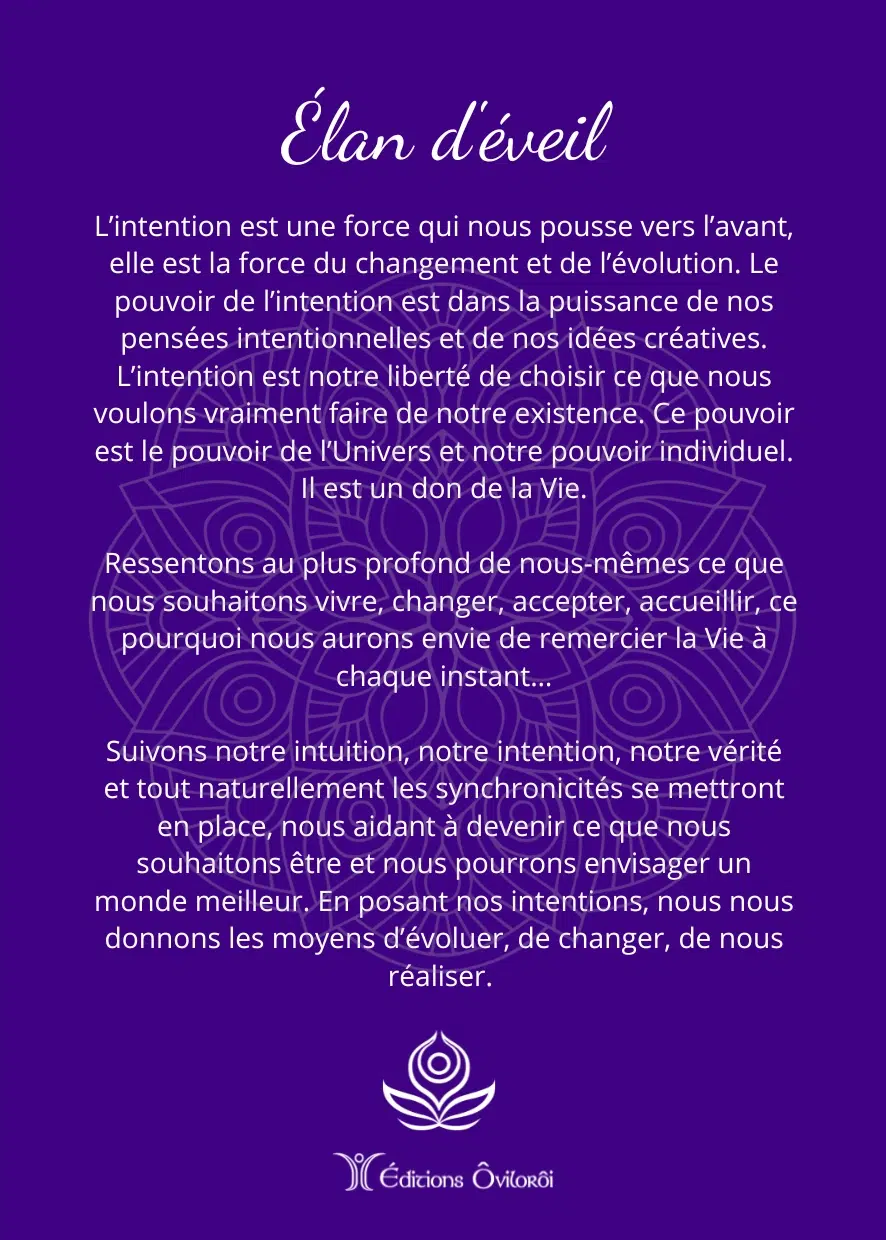 Le livre explicatif qui vous accompagne recèle un véritable enseignement, vous permettant d'agir sur votre réalité et de déclencher d'heureuses coïncidences. Chaque carte délivre un message pour accéder à vos facultés intuitives, développer votre créativité et affirmer votre véritable personnalité. Chaque illustration est porteuse d'une énergie qui vous invite à ouvrir votre intuition et à trouver les moyens de réaliser vos désirs les plus profonds. Ce jeu délivre des messages inspirants qui vous placent au centre de votre vie et de votre pouvoir créateur. À la lumière de votre intention, ce jeu de carte « élan d’éveil » vous connecte à ces facultés parfois insoupçonnées qui éclairent votre quotidien et votre pouvoir d’agir sur votre réalité.