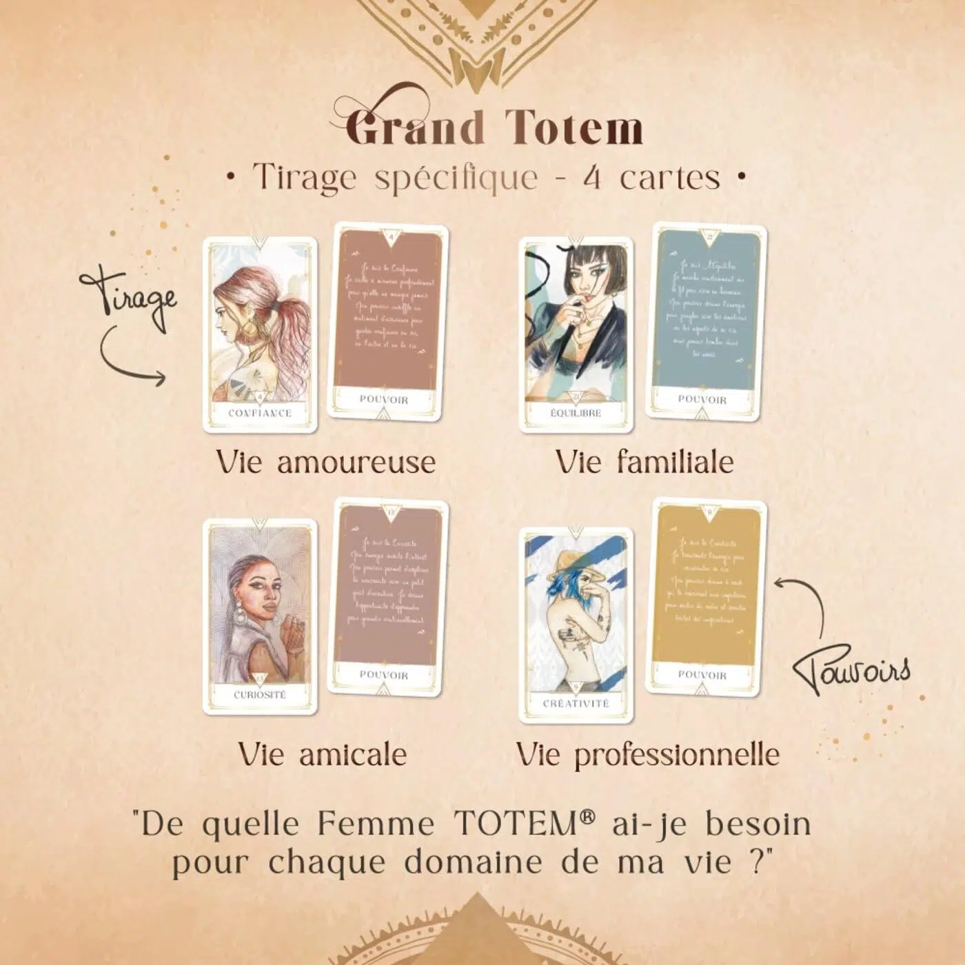 Favoriser sa sérénité, se redonner du courage, suivre son intuition, développer sa confiance... Les femmes totems vous aident à identifier ce que vous ressentez.
