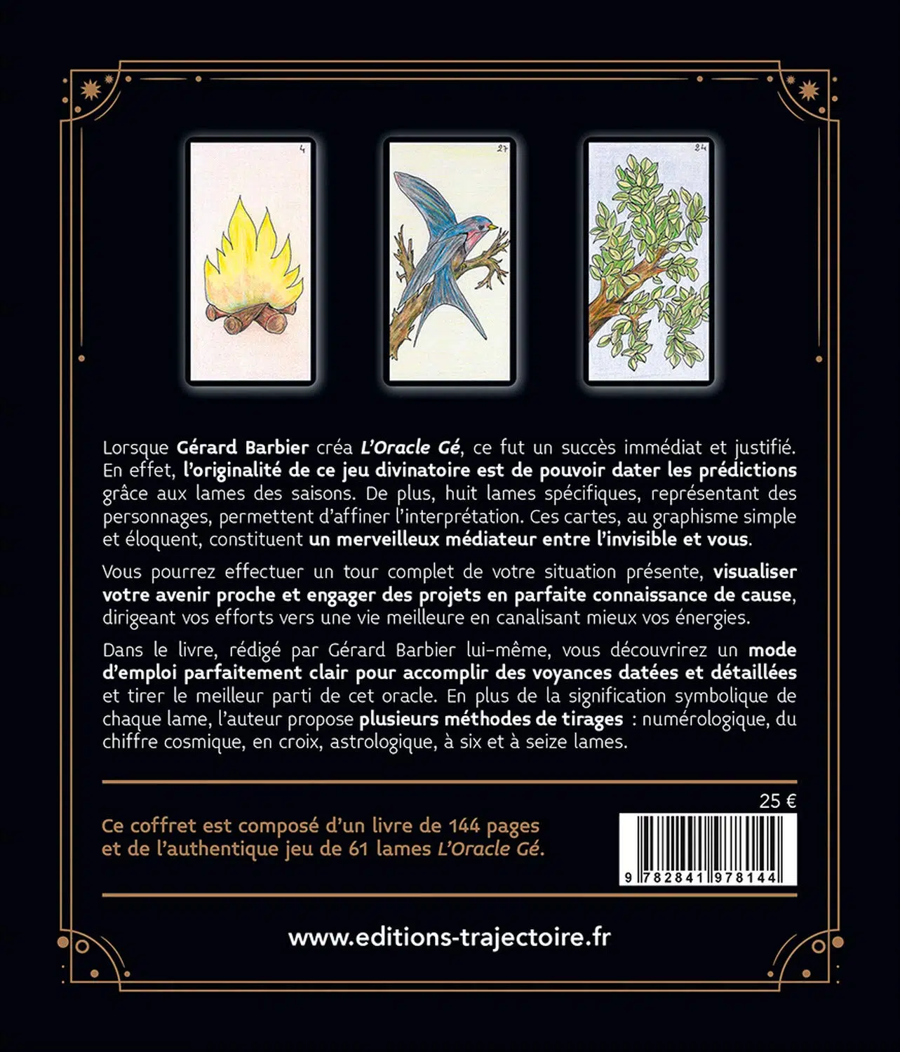 Il existe certains jeux indémodables, et dont la réputation a fait d’eux de véritables références. L’oracle Gé est l’un de ceux-là. Depuis 1991, ce jeu a su se faire une place de choix dans l’univers de la divination, grâce à la simplicité et l’éloquence de ses cartes. Bien que son graphisme ne soit pas toujours au goût de tous, le choix des cartes qui le composent permet des tirages extrêmement puissants. A la fois facile d’accès et d’une précision redoutable, ce jeu est devenu une référence utilisée par la majorité des professionnels de la cartomancie, tout en restant accessible aux néophytes.