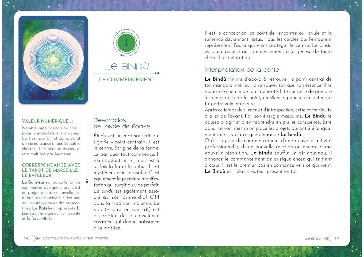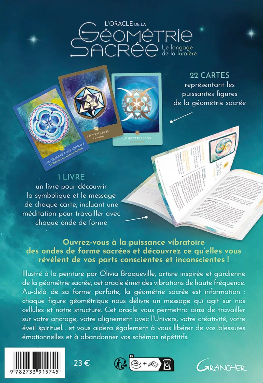 Illustré à la peinture par Olivia Braqueville, artiste inspirée et gardienne de la géométrie sacrée, cet oracle émet des vibrations de haute fréquence. Au-delà de sa forme parfaite, la géométrie sacrée est information: chaque figure géométrique nous délivre un message qui agit sur nos cellules et notre structure. Cet oracle vous permettra ainsi de travailler sur votre ancrage, votre alignement avec l’Univers, votre créativité, votre éveil spirituel… et vous aidera également à vous libérer de vos blessures émotionnelles et à abandonner vos schémas répétitifs.