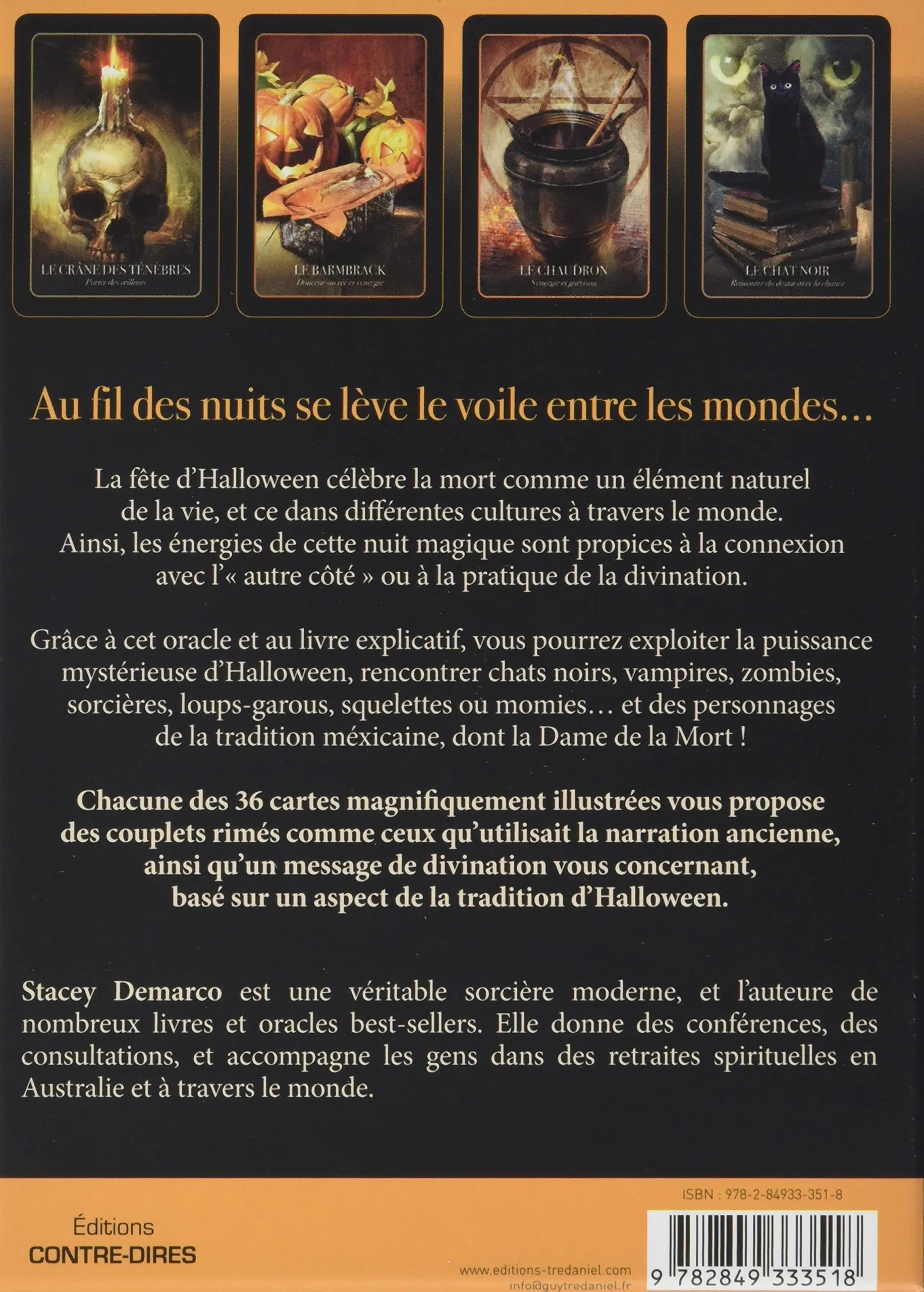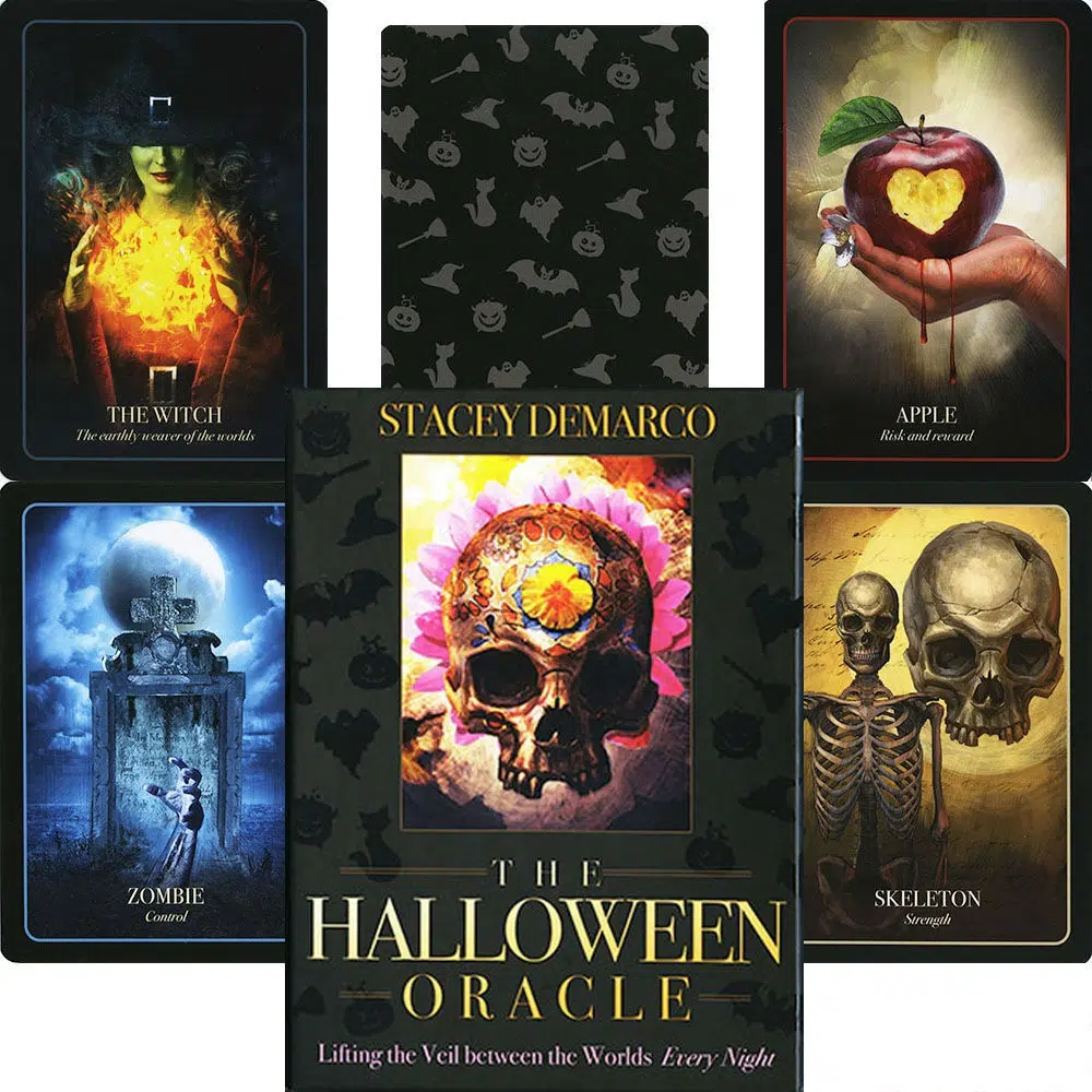 Maintenant, vous pouvez exploiter la puissance mystérieuse d’Halloween tous les soirs de l’année, rencontrer chats noirs, vampires, zombies, sorcières, loups-garous, squelettes, momies, bonbons, crânes… et des personnages de la tradition mexicaine, dont la Dame de la Mort, et plus encore! Chacune des 36 cartes d'enseignement richement illustrées a un sens et vous propose des couplets rimés comme ceux qu’utilisait la narration ancienne, ainsi qu’un message de divination vous concernant, basé sur un aspect de la tradition d’Halloween.