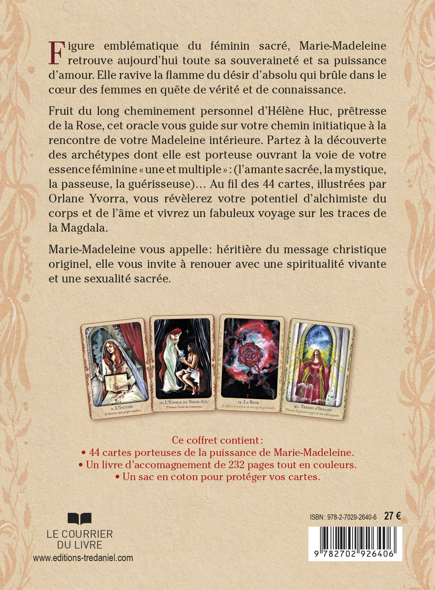 Fruit du long cheminement personnel d’Hélène Huc, prêtresse de la Rose, cet oracle vous guide sur votre chemin initiatique à la rencontre de votre Madeleine intérieure. Partez à la découverte des archétypes dont elle est porteuse, ouvrant la voie de votre essence féminine « une et multiple » (l’amante sacrée, la mystique, la passeuse, la guérisseuse)… Au fil des 44 cartes, illustrées par Orlane Yvorra, vous révélerez votre potentiel d’alchimiste du corps et de l’Âme et vivrez un fabuleux voyage sur les traces de la Magdala.