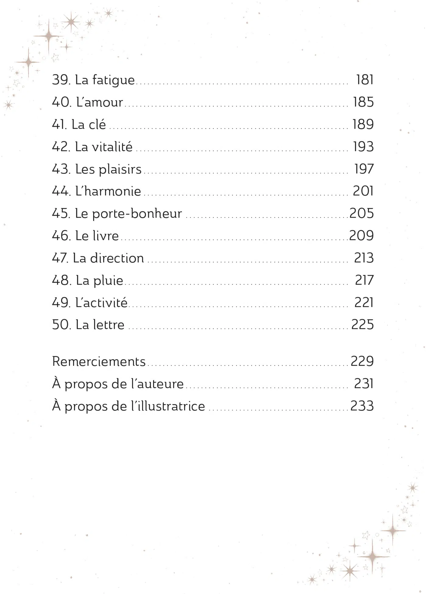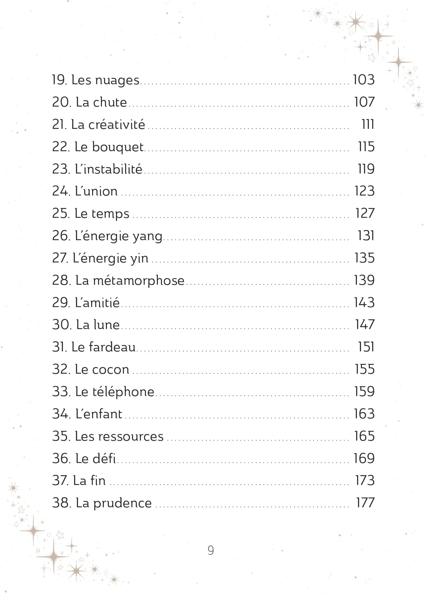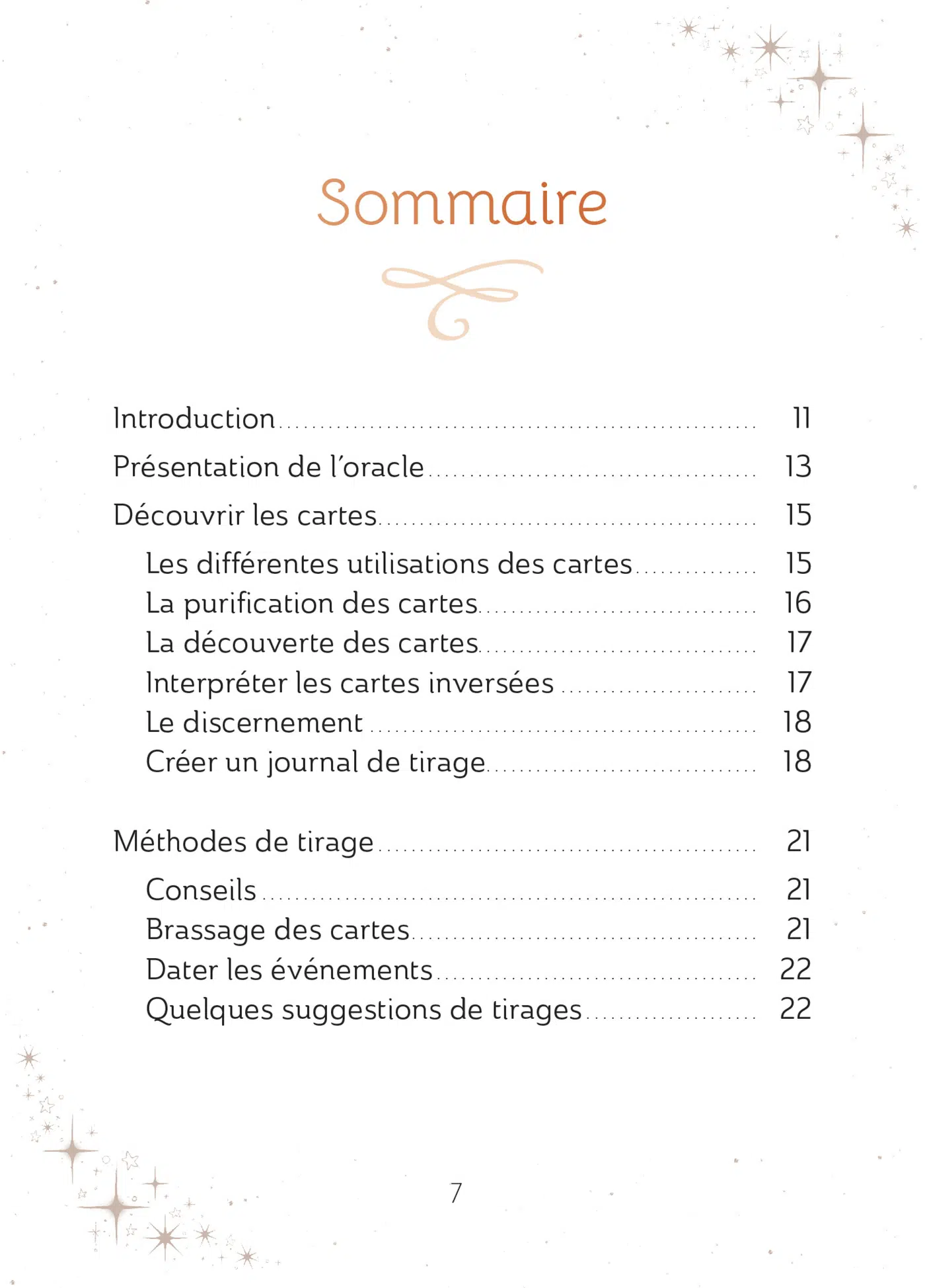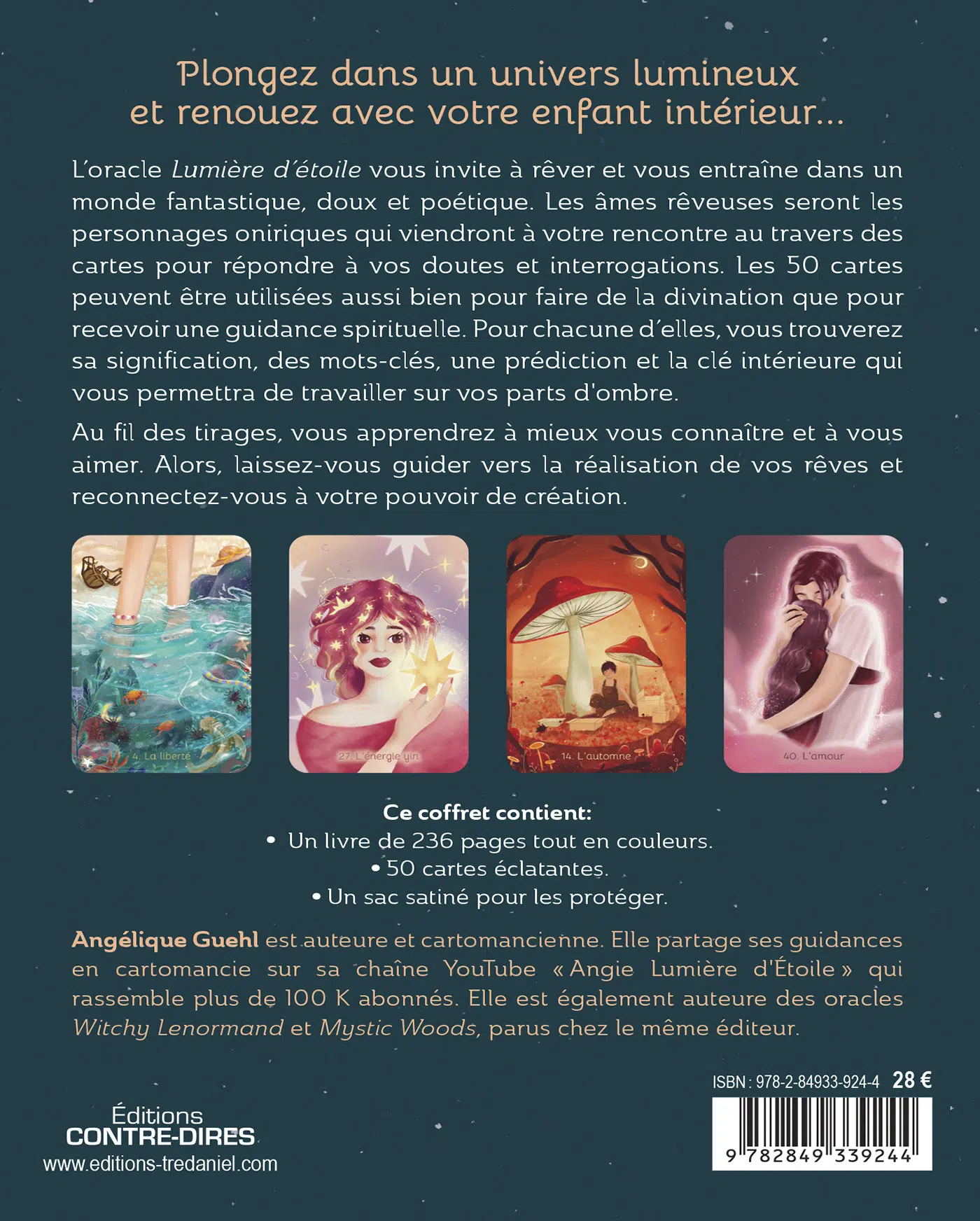 L’oracle Lumière d’étoile vous invite à rêver et vous entraîne dans un monde fantastique, doux et poétique. Les âmes rêveuses seront les personnages oniriques qui viendront à votre rencontre au travers des cartes pour répondre à vos doutes et interrogations. Les 50 cartes peuvent être utilisées aussi bien pour faire de la divination que pour recevoir une guidance spirituelle. Pour chacune d’elles, vous trouverez sa signification, des mots-clés, une prédiction et la clé intérieure qui vous permettra de travailler sur vos parts d'ombre.